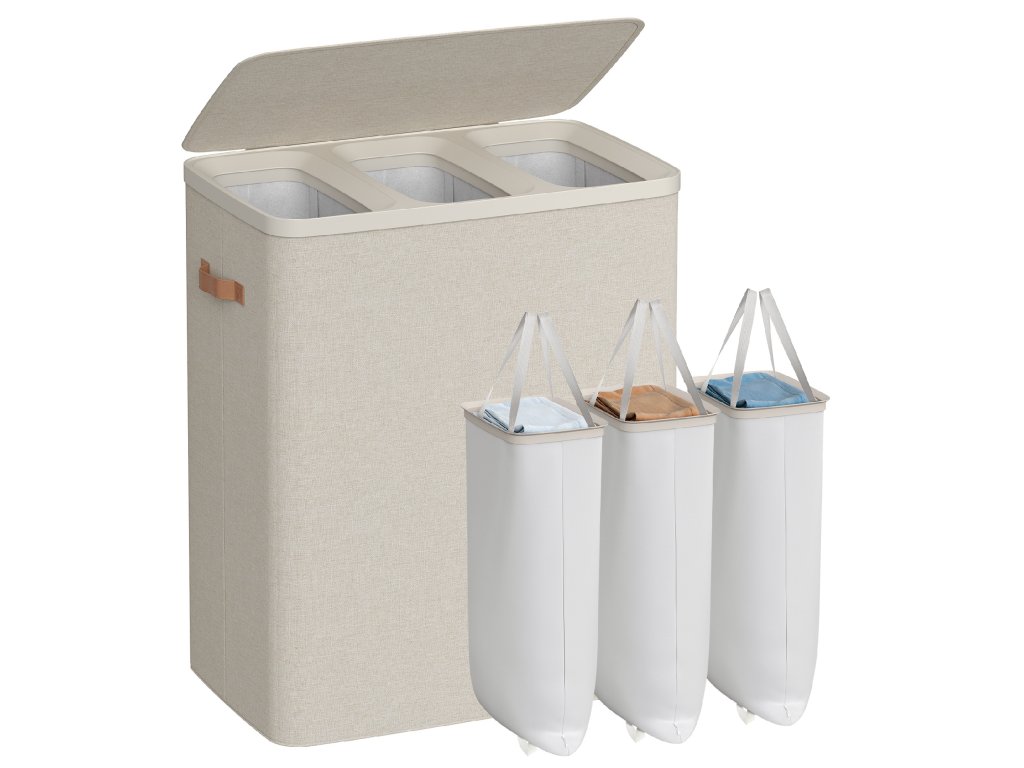 Snadné třídění prádla: Díky 3 přihrádkám vám tento koš na prádlo pomůže snadno třídit tmavé, světlé a barevné prádlo, což zjednoduší praní. Velmi snadná montáž a použití: Košík jednoduše rozložte a vložte 4 sklolaminátové tyče, abyste mu dali požadovaný tvar. Vnitřní vak je připraven k použití bez nutnosti montáže a je vybaven rukojeťmi pro snadné vyjmutí a výměnu. Prostorný: S rozměry 64 x 40 x 75 cm nabízí tento třídílný koš na prádlo kapacitu 190 litrů, což stačí k uspořádání týdenního množství prádla pro celou rodinu. Snadné přenášení a vyprazdňování: Rukojeti na koši i vnitřním sáčku usnadňují přenášení prádla, a to i po schodech nahoru a dolů. Spodní rukojeť na sáčku zajišťuje snadné vyprazdňování. Ochranné víko pro soukromí: Víko chrání oblečení před prachem a udržuje vaše prádlo mimo dohled. Rukojeť s PU úchytkou umožňuje snadné otevírání. Barva: Cappuccino béžová. Materiál: Polyesterová tkanina 150 g/m², PP plast, skelné vlákno. Rozměry výrobku: 64 x 40 x 75 cm. Hmotnost výrobku: 2,9 kg. Max. statická nosnost celkem: 25 kg