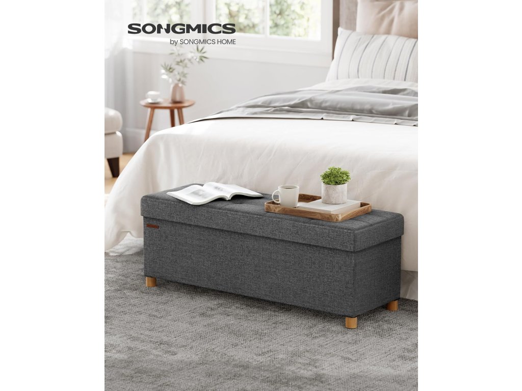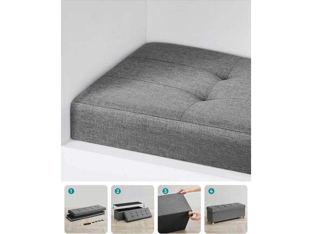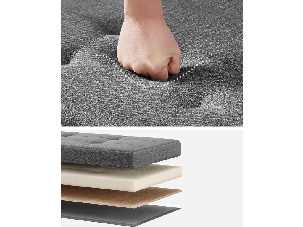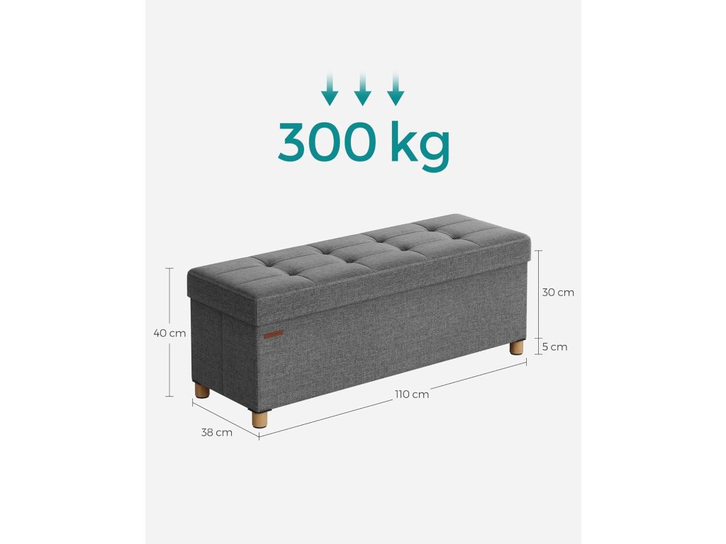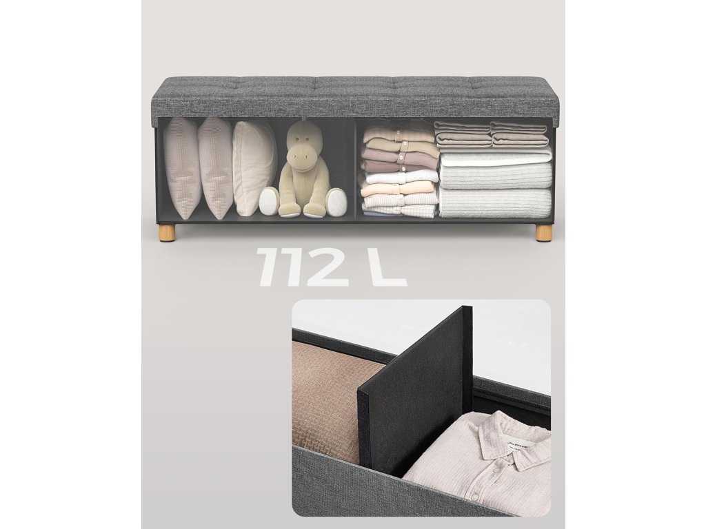 Tento sedací vak má elegantní povrch z lněné tkaniny, který dodá vašemu prostoru elegantní nádech. Dvojitá vrstva tkaniny a vysoce pružná pěna zajišťují trvalé pohodlí a relaxaci. Tato úložná lavice je vyrobena z pevné MDF desky a vyztužena kovovými rohovými chrániči na víku. Unese až 300 kg, takže je spolehlivou volbou pro sezení nebo skladování. Tato stolička má rozměry 110 x 38 x 40 cm a objem 112 litrů, což je ideální pro uložení oblečení, knih a dalších předmětů. 4 nohy této úložné lavice udrží pod ní čistotu. Každá noha má protiskluzovou podložku, která zajišťuje stabilitu a zabraňuje poškrábání podlahy. Tento skládací taburet slouží jako úložný box, sedák a dokonce i konferenční stolek! Perfektně se hodí do obývacího pokoje, ložnice, předsíně, šatny nebo studentského pokoje a splní tak různé potřeby. Barva: tmavě šedá. Materiál: MDF deska, pěnová výplň, látka. Rozměry: 110 x 38 x 40 cm. Hmotnost: 10 kg. Maximální statická nosnost: 300 kg. Kapacita: 112 litrů