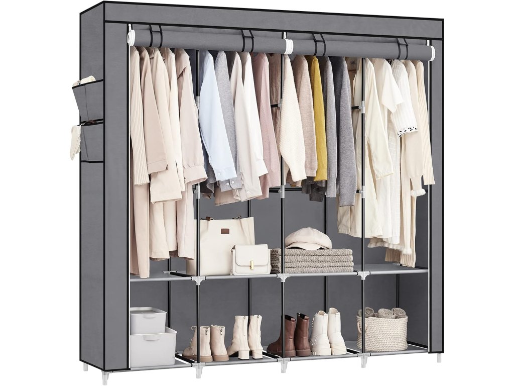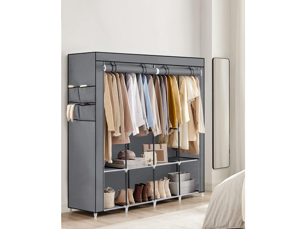 Tento věšák na oblečení je vyroben z ocelových trubek o průměru 0,6" a vyztužených plastových spojů a poskytuje pevnou oporu pro vaše oblečení (max. statické zatížení na tyč: 15 kg). Tato šatní skříň má 4 závěsné části s maximální výškou zavěšení 122 cm, aby se vaše košile, kabáty a sukně nepomačkaly, a police na uložení bot nebo tašek. Velká kapacita, více překvapení. Tato látková šatní skříň má na jedné straně 4 úložné kapsy pro uložení drobností, jako jsou ponožky, klíče a rukavice. Nebudete muset hledat drobnosti, když budete spěchat ven. Stačí spojit všechny kovové trubky plastovými spojkami, nasadit látkový potah a tuto přenosnou skříň máte hotovou raz dva – žádné šrouby, žádné nářadí, žádné potíže! Přenosná šatní skříň se 4 závěsnými částmi a 4 bočními kapsami pro uspořádání oblečení, sada proti převrácení pro větší bezpečnost a snadný proces montáže s jasnými pokyny. Barva: Šedá. Materiál: Ocel, netkaná textilie, plast. Rozměry výrobku: 170 x 45 x 167 cm. Hmotnost výrobku: 5 kg. Max. statická nosnost každé závěsné tyče: 15 kg. Max. statická nosnost každé police: 5 kg