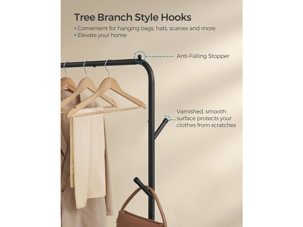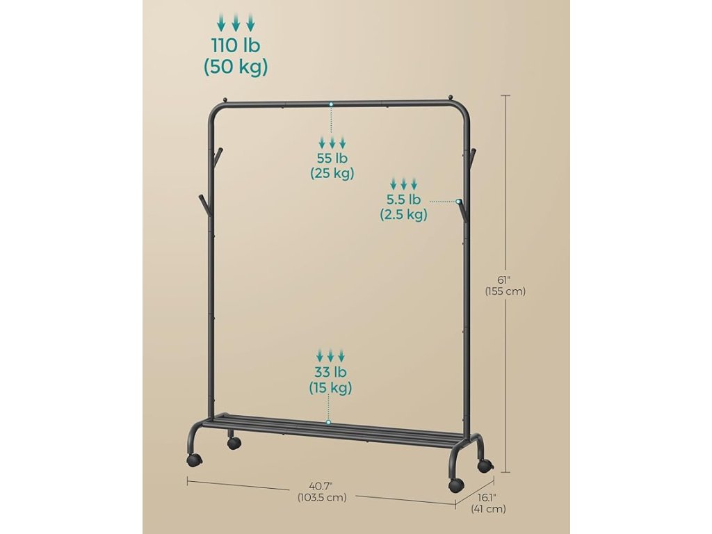S vysokou tyčí pro zavěšení oblečení různých délek, háčky na obou stranách na tašky a klobouky a spodní policí na krabice a boty uchovává tento stojan na oblečení všechny vaše nezbytnosti na jednom místě. Vysoká tyč na zavěšení oblečení umožňuje snadné proudění vzduchu a podporuje rychlé sušení. Nabízí dostatek prostoru pro zavěšení, aby se zabránilo hromadění a nepořádku v oblečení, a usnadňuje k němu přístup. Díky 4 otočným kolečkům můžete dvojitý šatní věšák snadno posouvat do jakékoli místnosti v domě. 2 z koleček jsou uzamykatelná, takže můžete věšák nechat na jednom místě. Díky šroubům, které zajišťují 22 mm silné ocelové trubky, má tento stojan na oblečení stabilní rám s nosností až 50 kg. Každá kolejnice má maximální statickou nosnost 25 kg, každý hák až 2,5 kg a spodní police unese až 15 kg. Jeho jednoduchá konstrukce, očíslované díly a ilustrovaný a snadno čitelný návod usnadňují sestavení tohoto odolného šatního stojanu. Barva: Inkoustově černá. Materiál: Ocel. Rozměry výrobku: 103,5 x 41 x 155 cm. Hmotnost výrobku: 3,5 kg. Max. statická nosnost na lištu: 25 kg. Max. statická nosnost na hák: 2,5 kg. Max. statická nosnost spodní police: 15 kg. Max. celková statická nosnost: 50 kg