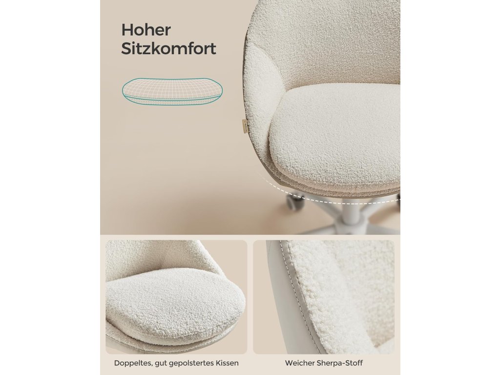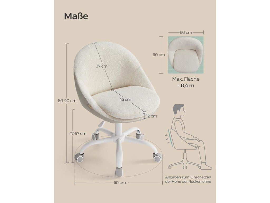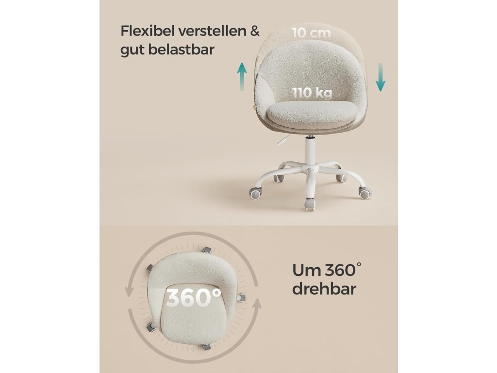 Díky elegantnímu vzhledu a jednoduchým geometrickým liniím dodá tato otočná židle vašemu pokoji jedinečné kouzlo. Můžete ji použít k práci, studiu nebo k líčení. Tato kompaktní kancelářská židle otočná o 360° (60 x 60 cm) je výškově nastavitelná o 10 cm a nemá žádné područky. Když se židle nepoužívá, můžete ji zasunout pod stůl a ušetřit tak místo. Dvojitý dobře polstrovaný polštář (horní o tloušťce 7 cm), zakřivený velký sedák ulevuje od tlaku na boky; potah ze směsi bavlny a lnu je prodyšný. Vše nabízí vysoké pohodlí při sezení. Připevněte základní desku ke spodní části sedáku pomocí šroubů, nainstalujte plynové lahve a kolečka - jen pár kroků a počítačová židle je smontována. Barva: béžová. Materiál: Ocelový rám, směs bavlny a lnu, nylonová kolečka, pěnová výplň 28 kg/m³. Rozměry: 60 x 60 x (80-90) cm. Výška sedáku (od podlahy): 47-57 cm. Rozměry sedáku: 45 x 42 cm. Výška opěradla: 47 cm. Celková tloušťka polštáře: 12 cm. Tloušťka horního polštáře: 7 cm. Hmotnost: 8,2 kg. Max. statická nosnost: 110 kg