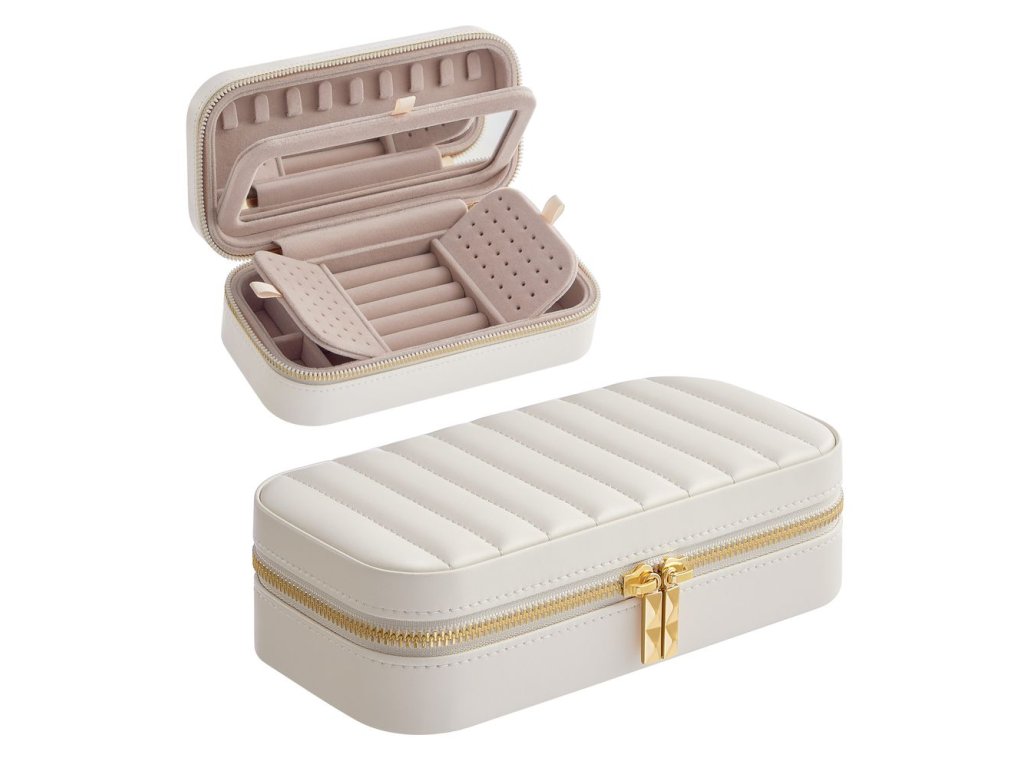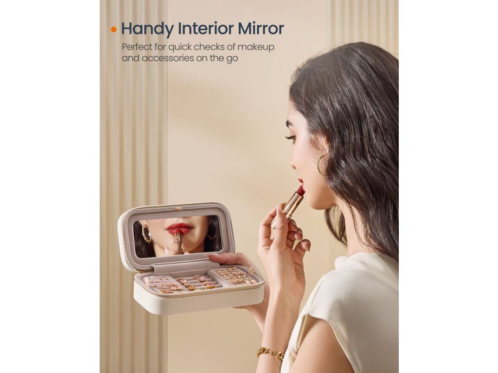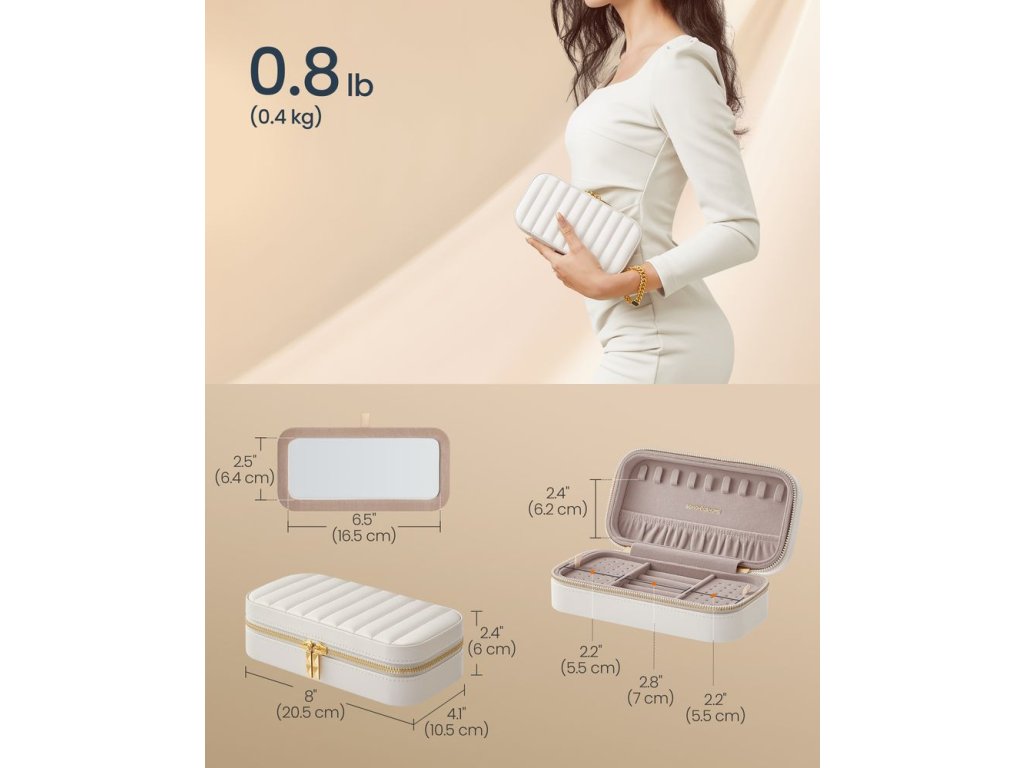 Vaše dokonalé řešení pro uložení šperků se vyznačuje elegantním, měkkým PU povrchem s propracovaným prošíváním a unikátním kováním ve stylu pyramidy, které pozvedne vaše šperky a vytvoří jedinečný dojem. Cestujte stylově s naší přenosnou šperkovnicí o rozměrech 20,5 x 10,5 x 6 cm, která se bez námahy vejde do tašky nebo kufru. Dodává se s nezávislým zrcátkem pro rychlou kontrolu líčení a hladkými zipy pro snadný přístup. S nastavitelnými přepážkami, otvory pro prsteny, vyhrazenou částí pro náhrdelník a 2 odnímatelnými deskami na náušnice tato malá šperkovnice zajistí, že vše dorazí tak pěkně, jak jste to zabalili – žádné zamotání, uzly ani oděrky, a to ani během dlouhých cest. Tato šperkovnice je navržena s robustním rámem z MDF a voděodolným a otěruvzdorným povrchem a zachovává si svůj tvar i při stlačení. v zavazadle. Podšitá měkkým sametem chrání vaše šperky před poškrábáním. Potěšte své blízké touto nádhernou cestovní šperkovnicí – skutečným symbolem vytříbeného vkusu. Ideální pro bezpečné uložení jejich šperků na cestách. A proč si nedopřát i trochu luxusu? Barva: Světle bílá. Materiál: PU (polyuretanová) kůže, MDF (dřevovláknitá deska střední hustoty), samet, kov, sklo. Rozměry výrobku: 20,5 x 10,5 x 6 cm. Hmotnost výrobku: 0,4 kg.