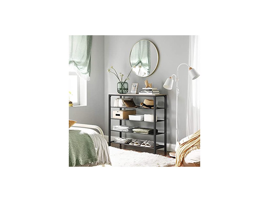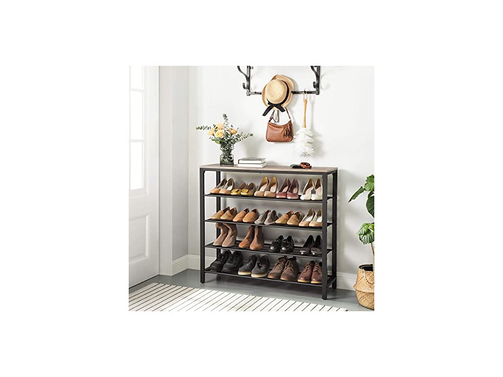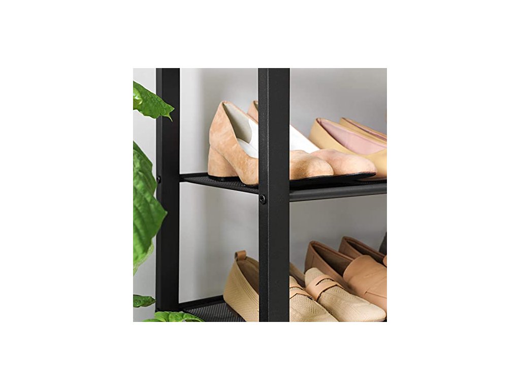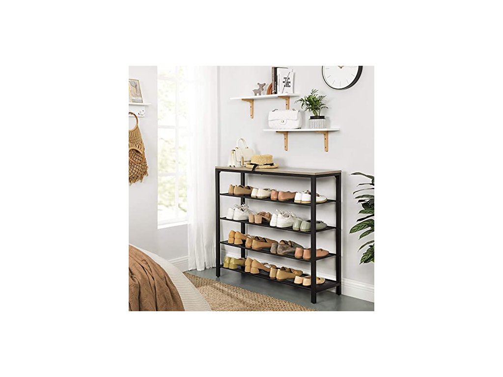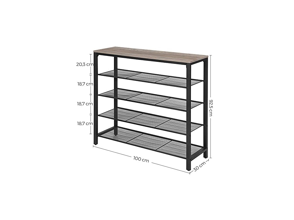 4 otevřené police s hustým železným pletivem nabízejí dostatek prostoru pro vaše boty. Poutavý šedohnědý povrch. Horní plocha unese až 10 kg, každá z polic na boty až 5 kg