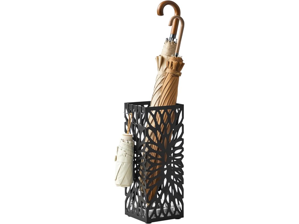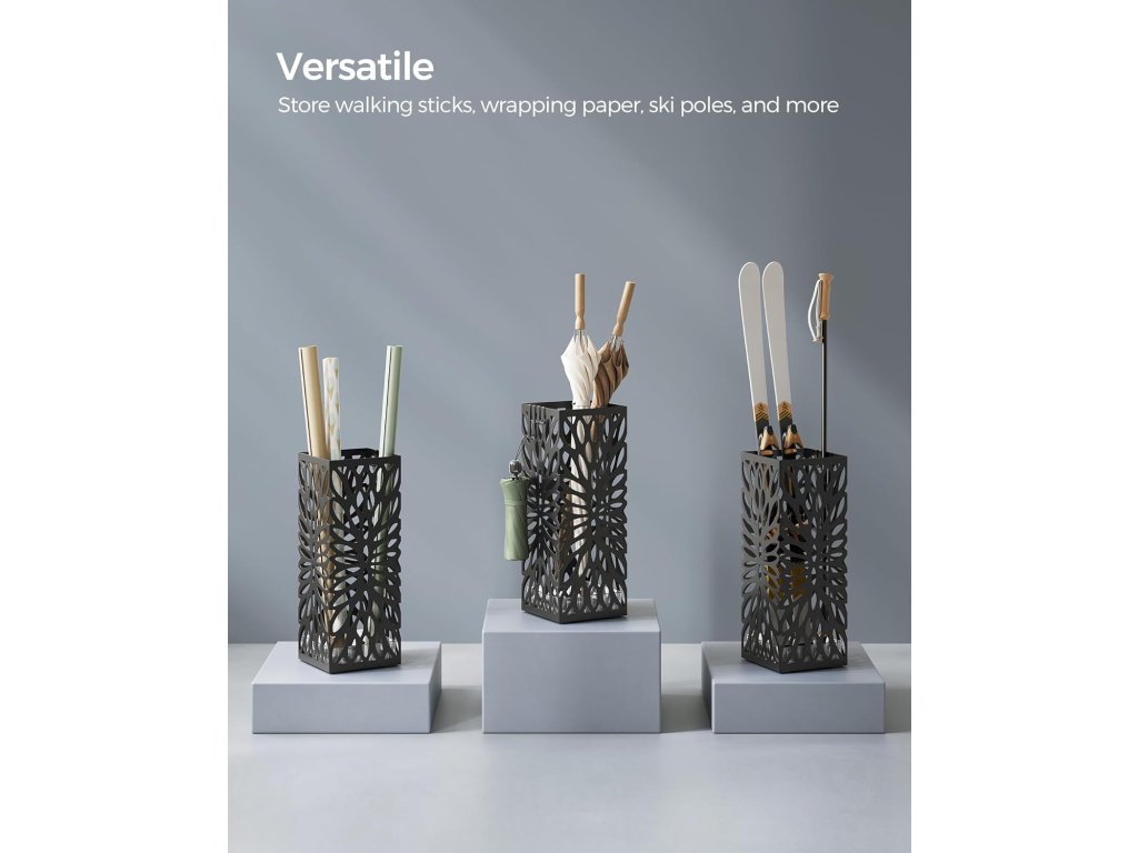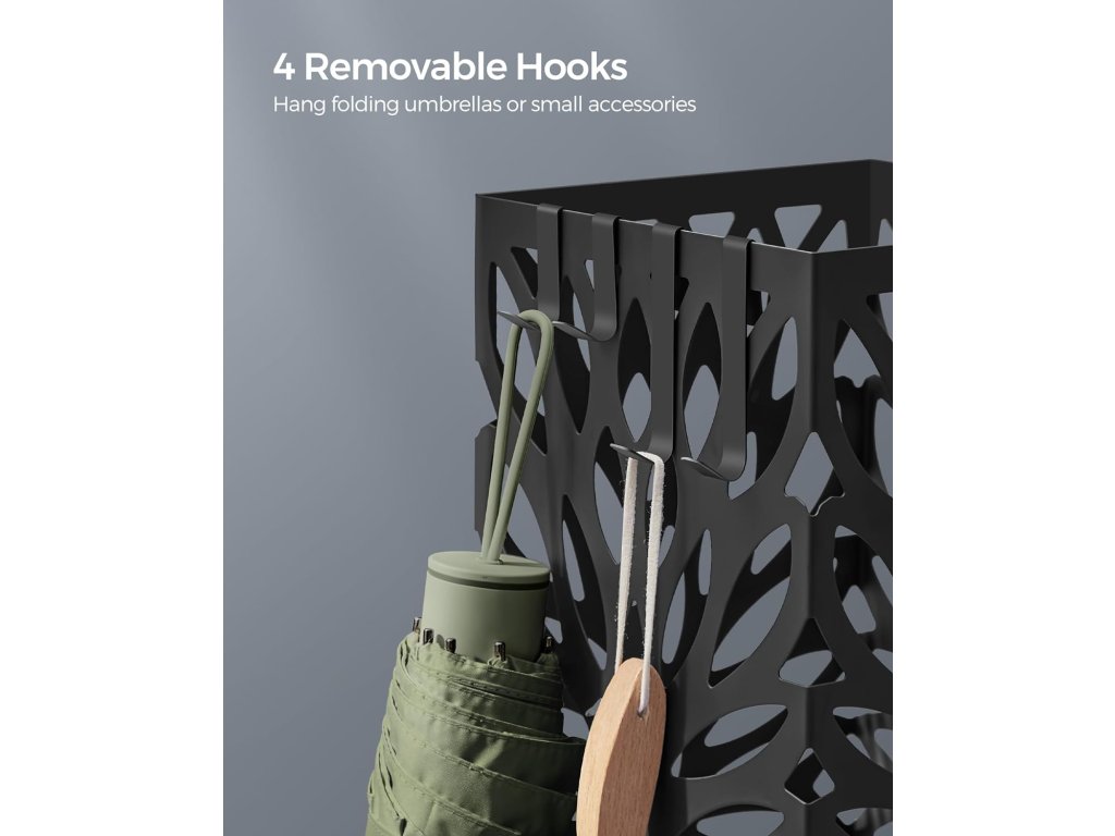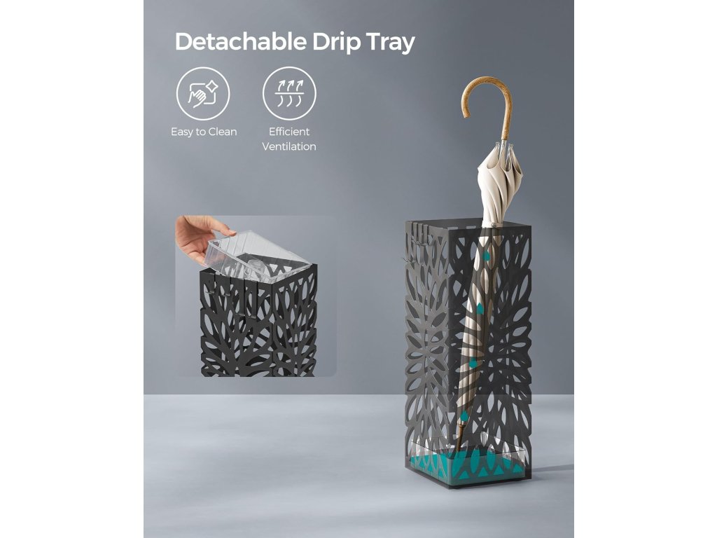 Náš kovový držák deštníků nabízí větší pohodlí díky odnímatelné plastové vaničce na odkapávání a 4 odnímatelným háčkům. Tyto uživatelsky přívětivé prvky zajišťují snadné čištění a poskytují praktické řešení pro zavěšení skládacích deštníků. Volně stojící ocelový čtvercový stojan na deštníky a na vycházkové hole, s odnímatelným odkapávačem, 4 háčky