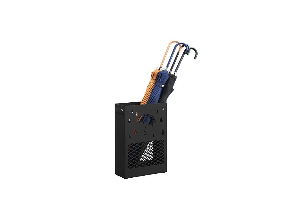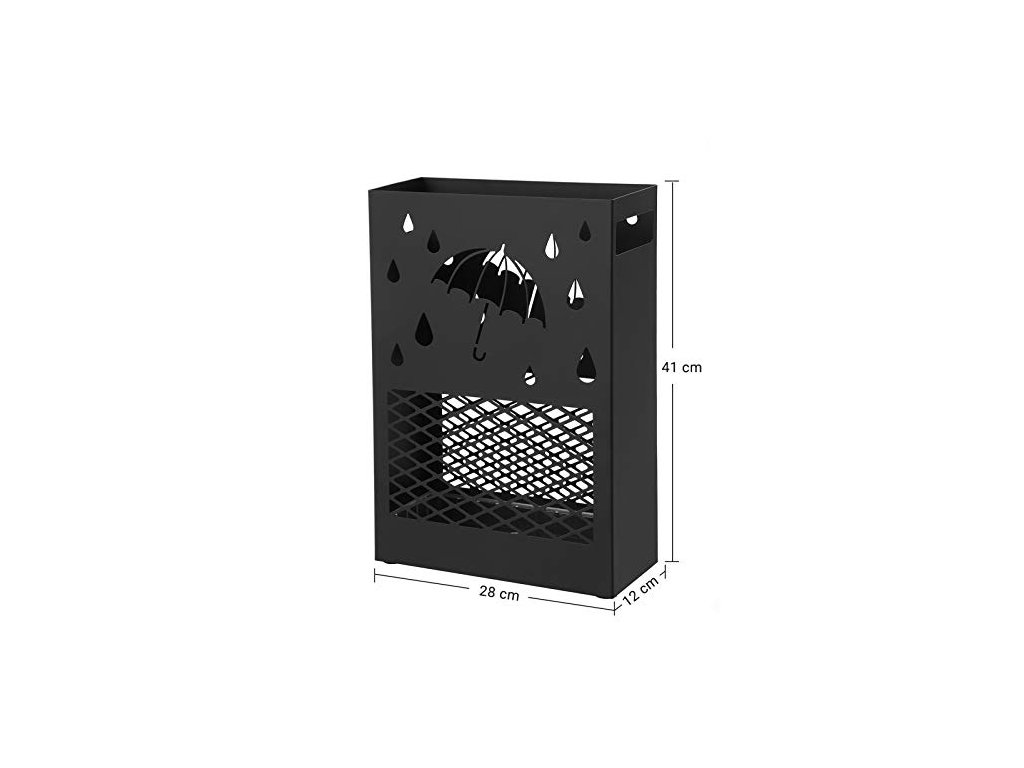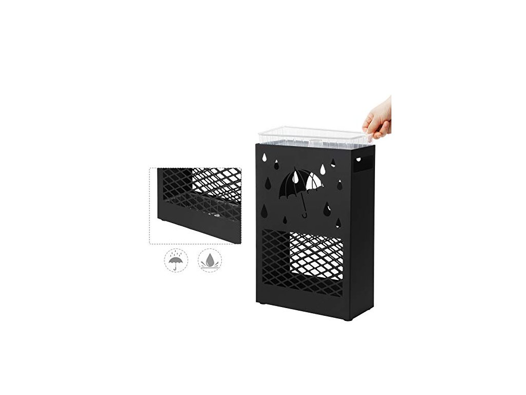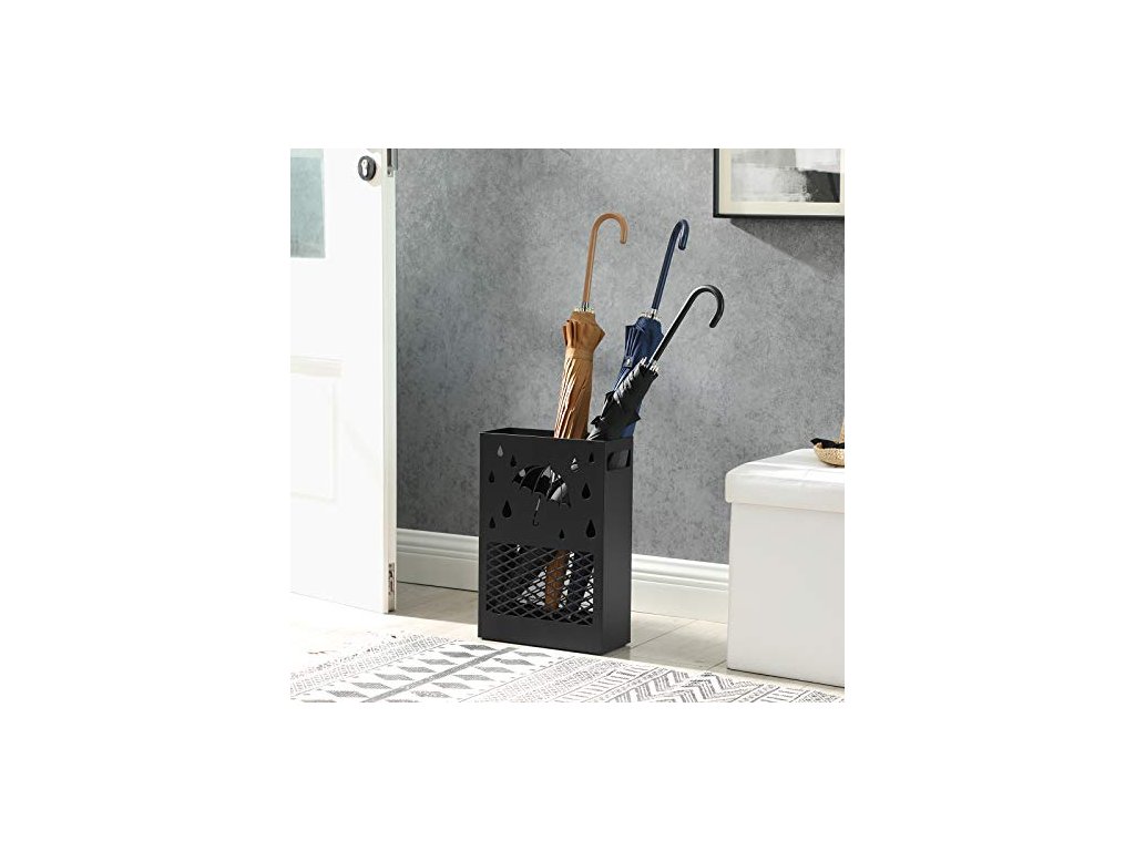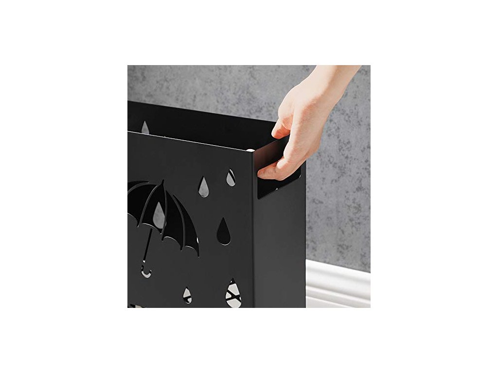 Dobré materiály mluví samy za sebe. Stojan na deštníky je vyroben z vysoce kvalitní oceli a je vždy stabilní, i když je plně zatížen. Robustní stojan také slibuje dlouhou životnost. Kovový obdélníkový stojan na deštníky s odnímatelnou vaničkou na vodu, 4 háčky, design s výřezem
