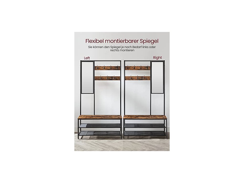 Stojan na kabáty s úložným prostorem na boty. Věšák se zrcadlem, háčky, lavicí a policemi na boty. Zrcadlo o rozměrech 80 x 30 cm lze namontovat vlevo nebo vpravo podle vašich potřeb, takže se můžete zkontrolovat, než vyjdete z domu a začnete svůj den.