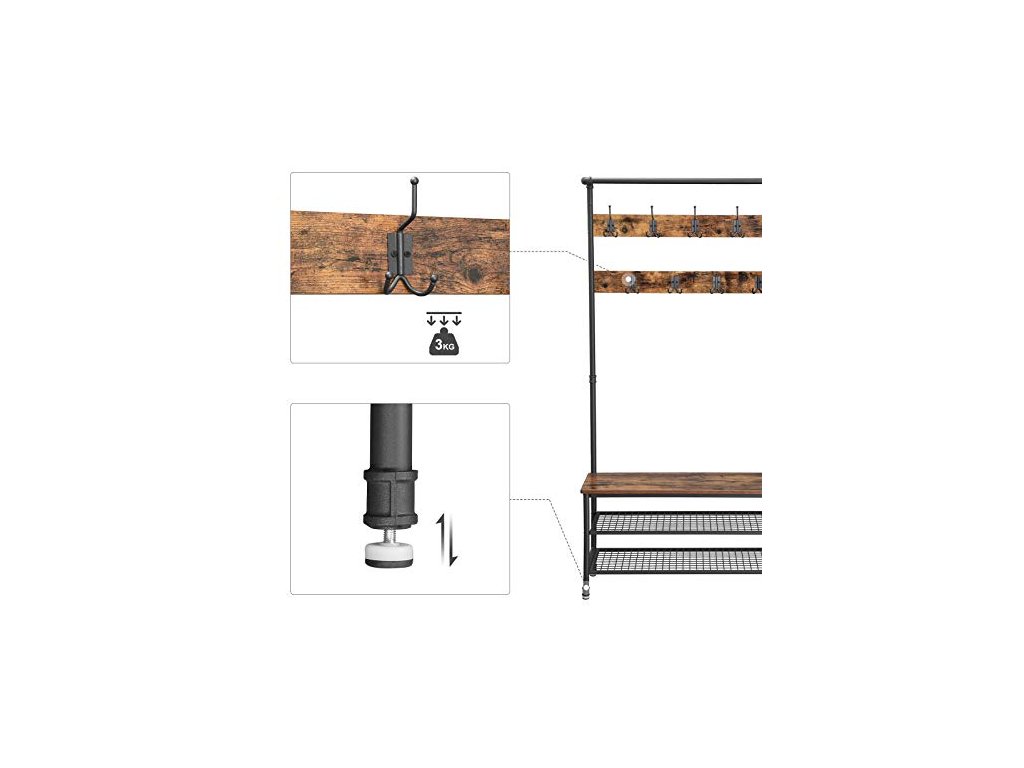 Po návratu domů na konci dne stačí pověsit kabát, klobouk a šály na některý ze 4 dvojitých háčků nebo 5 trojháčků, posadit se na lavici, sundat si boty a uložit je na některou ze 2 kovových síťovaných polic. Robustní ocelový rám