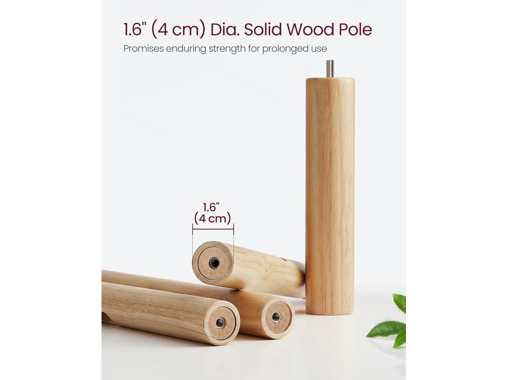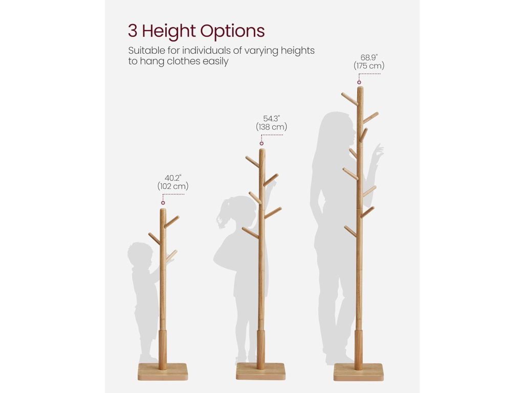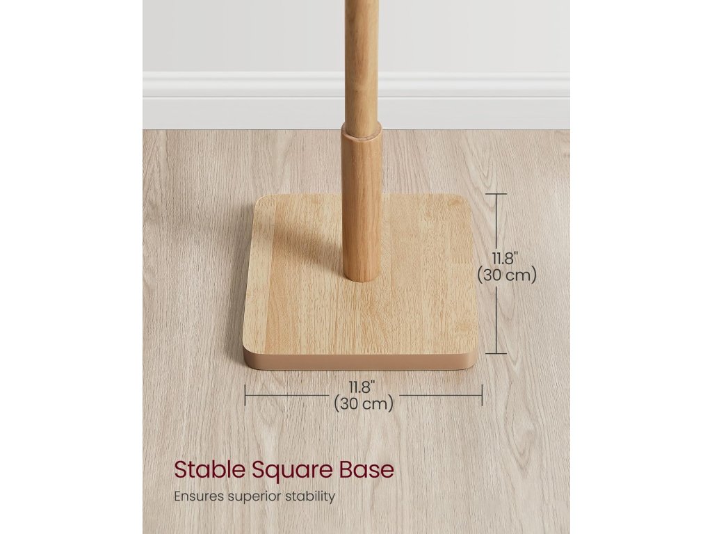Tento věšák na kabáty je navržen s vestavěnými závitovými díly a k montáži nevyžaduje žádné další nářadí. Jednoduše otočte háčky na místo podle jasných pokynů a je hotovo! Tento volně stojící věšák na kabáty je vyroben z robustního kaučukovníku a potažen trojvrstvou barvou, takže se vyznačuje dlouhou životností a nabízí hladký povrch vhodný pro nošení oděvů. Nastavitelný věšák na kabáty se 3 různými možnostmi výšky uspokojí potřeby různých uživatelů. Je perfektní pro každého člena rodiny, optimalizuje využití a snadno se přizpůsobí vašemu životnímu stylu. Věšák na kabáty má robustní hlavní tyč o průměru 4 cm, pevně spojenou s větvemi. Díky stabilní čtvercové základně stojí pevně a s jistotou unese až 24 kg, přičemž na jeden háček se vejde 3 kg. Díky svému elegantnímu a minimalistickému designu se tento věšák na oblečení bez problémů začlení do jakéhokoli prostředí. Je to více než jen funkční kus nábytku – je to špetka elegance pro vaši chodbu, ložnici, kancelář nebo obývací pokoj. Barva: Béžová. Materiál: Kaučukovník. Háčky a hlavní tyč, MDF (dřevovláknitá deska střední hustoty). Rozměry výrobku: 30 x 30 x 175 cm. Hmotnost výrobku: 3,9 kg. Max. celková statická nosnost: 24 kg