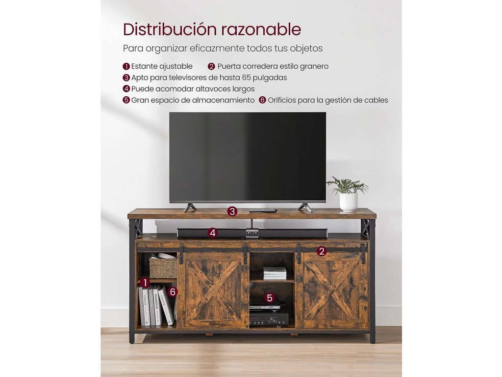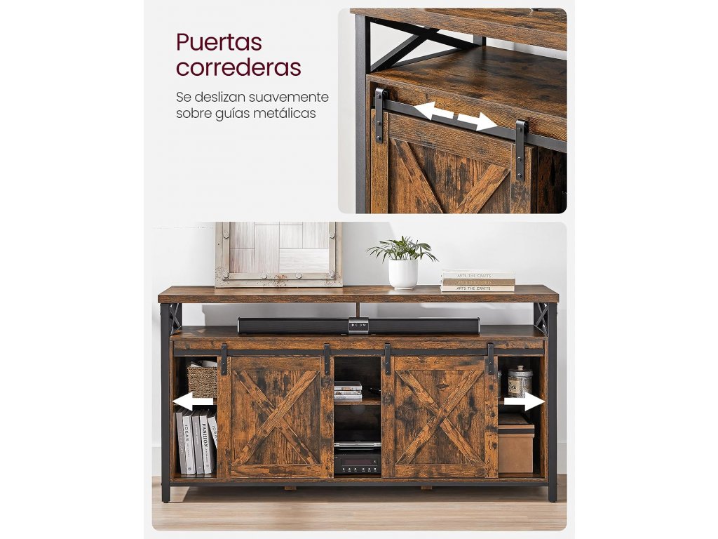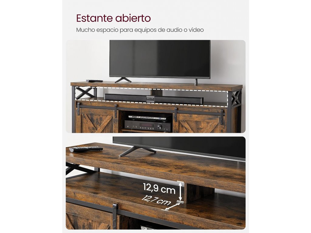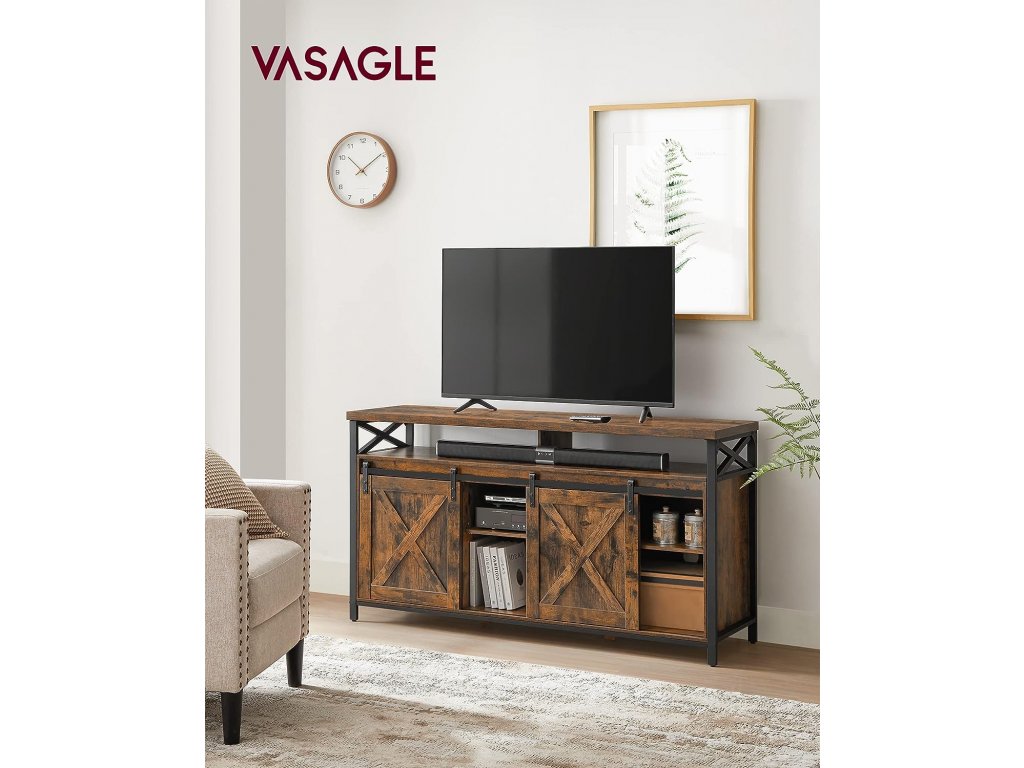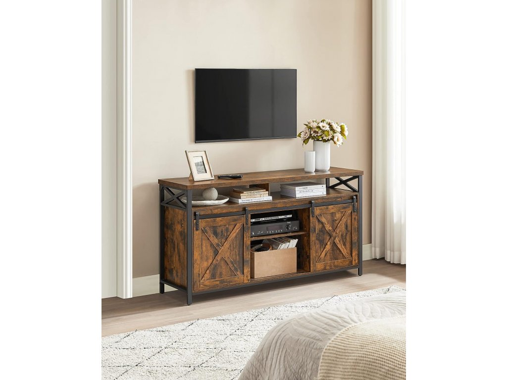 Vhodný pro televizory s úhlopříčkou až 65 palců. Tento televizní stojan s úložným prostorem je vyroben z dřevotřísky a oceli a unese celkem až 91 kg. 2 nastavitelné police za dvířky, 2 otevřené přihrádky oddělené nastavitelnou policí a otevřená police pod horní deskou. Dostatek prostoru pro vaše hry, filmy a multimediální zařízení. Díky 2 dveřím, rámům ve tvaru písmene X a rustikální hnědé barvě působí tato skříňka pod televizor industriálním dojmem. Bude hvězdou vašeho obývacího pokoje. Díky ilustrovaným návodům a očíslovaným dílům se tato skříňka na televizor snadno sestavuje. Dvířka skříňky bezpečně drží. Dva otvory pro kabely pomáhají udržet kabely pod kontrolou. Nastavitelné nožky zajišťují dobrou stabilitu i na mírně nerovných podlahách.