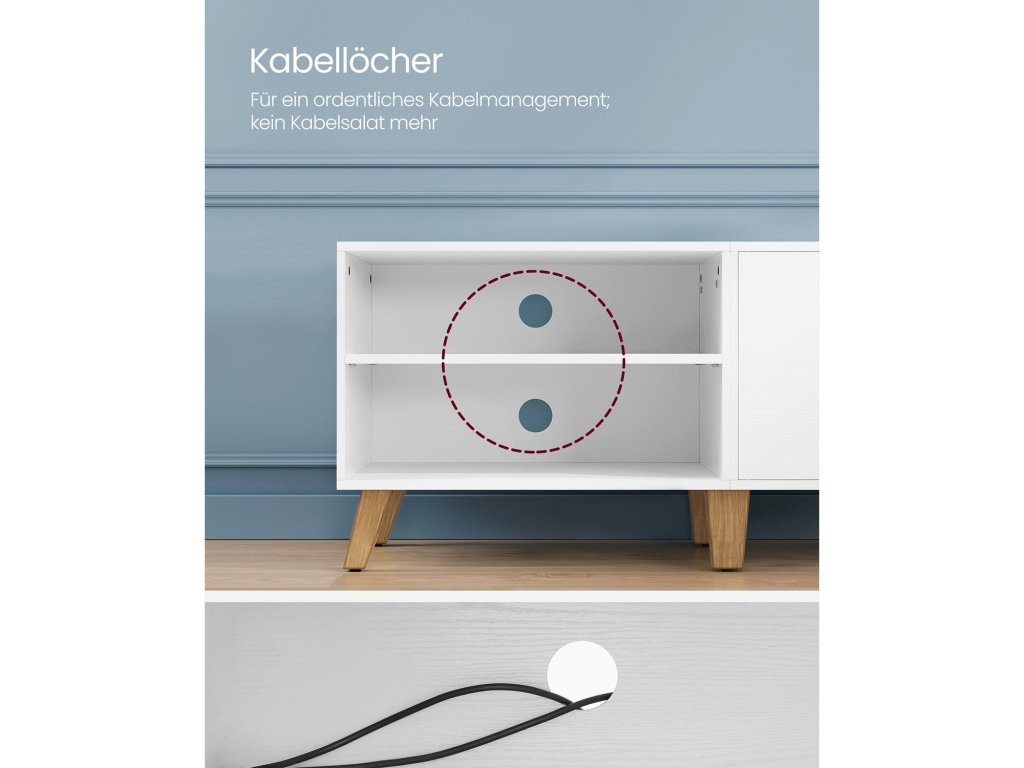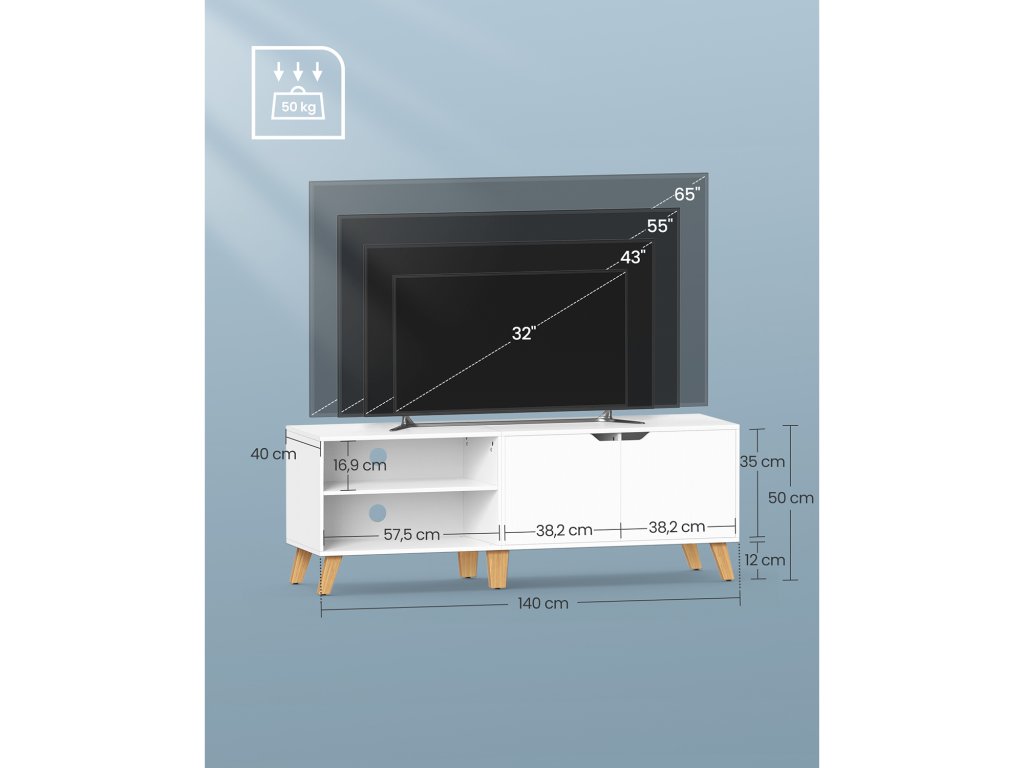 Tato elegantní bílá televizní skříňka vnese do vašeho obývacího pokoje nové kouzlo. Tento stojan pojme televize do úhlopříčky 65 palců. Malá televize? Využijte této příležitosti a uspořádejte rostliny po stranách. Umístěte konzole a boxy na 2 otevřené police a DVD uložte za dvířka. Číslované díly a podrobný, snadno srozumitelný návod vás doprovodí, abyste se z montáže tohoto televizního stojanu nestal horor. Tento bílý televizní nábytek se stane vaším spojencem na nedělní večer. Vyberte si balíček chipsů skrytý za magnetickými dvířky a užijte si filmový večer s rodinou nebo přáteli. Barva: Bílá. Materiál: Dřevotříska. Rozměry výrobku: 140 x 40 x 50 cm. Hmotnost výrobku: 26,2 kg. Max. statická nosnost: 50 kg