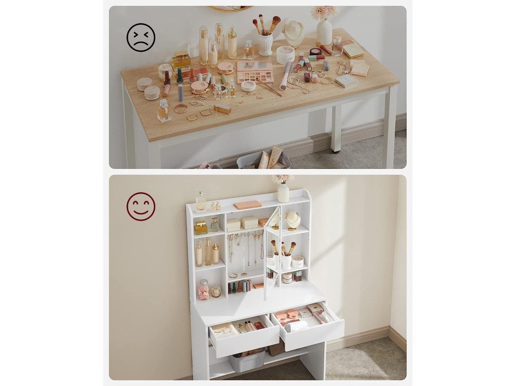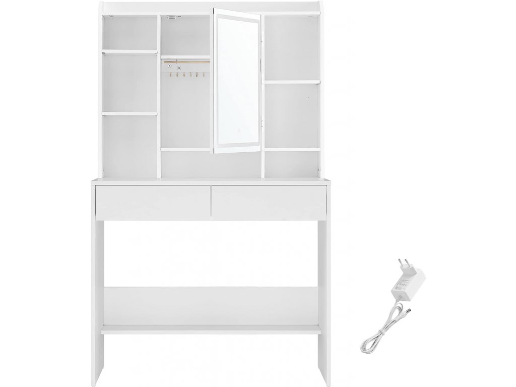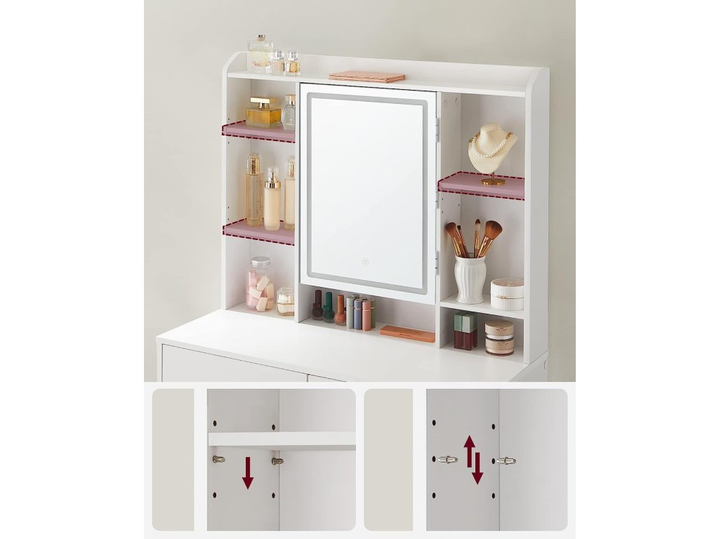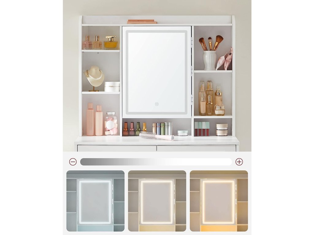 1 horní polička na parfémy, 7 otevřených přihrádek na kosmetiku, 2 přihrádky a háčky za zrcadlem, 1 deska stolu, 2 zásuvky a 1 polička ve spodní části, tento toaletní stolek vám poskytne značný prostor. Stolek s LED osvětlením se 3 barvami a nastavitelným jasem. Stisknutím dotykového tlačítka změníte barvy světla, stisknutím tlačítka na několik sekund upravíte jas, vše je sestaveno tak, abyste se mohli velmi rychle nalíčit! 2 desky vlevo a prostřední deska vpravo jsou nastavitelné do 3 výšek, aby se na ně vešly vaše produkty různých velikostí, například krémy na obličej, séra, podkladové báze, odličovače a další. Tento kosmetický stolek je vyroben z kvalitní dřevotřísky, je proto stabilní a dlouhodobě odolný. Jeho povrch je odolný proti opotřebení a snadno se čistí, bude vás provázet po dlouhá léta. Jednoduchý design, čisté linie a čistá bílá barva oživují tento moderní toaletní stolek, který vnese do vašeho pokoje nádech elegance.