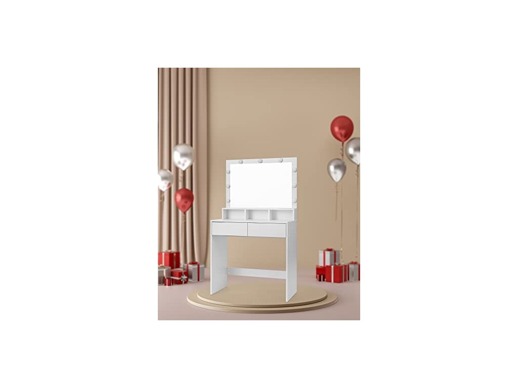 Více pořádku pro vaši kosmetiku: 2 velké zásuvky a 3 otevřené přihrádky toaletního stolku poskytují dostatek místa pro váš make-up a usnadňují organizaci kosmetiky. Toaletní stolek se zrcadlem a 9 LED žárovkami. Žárovky jsou stmívatelné.