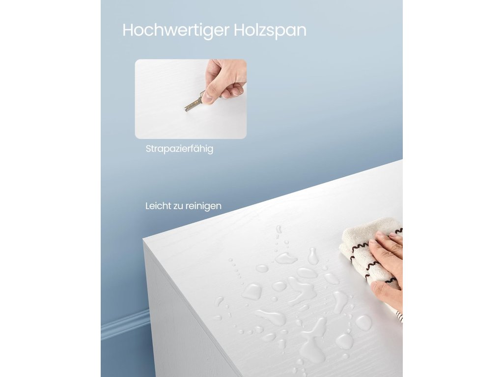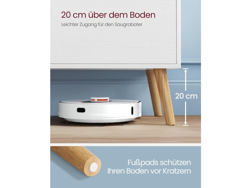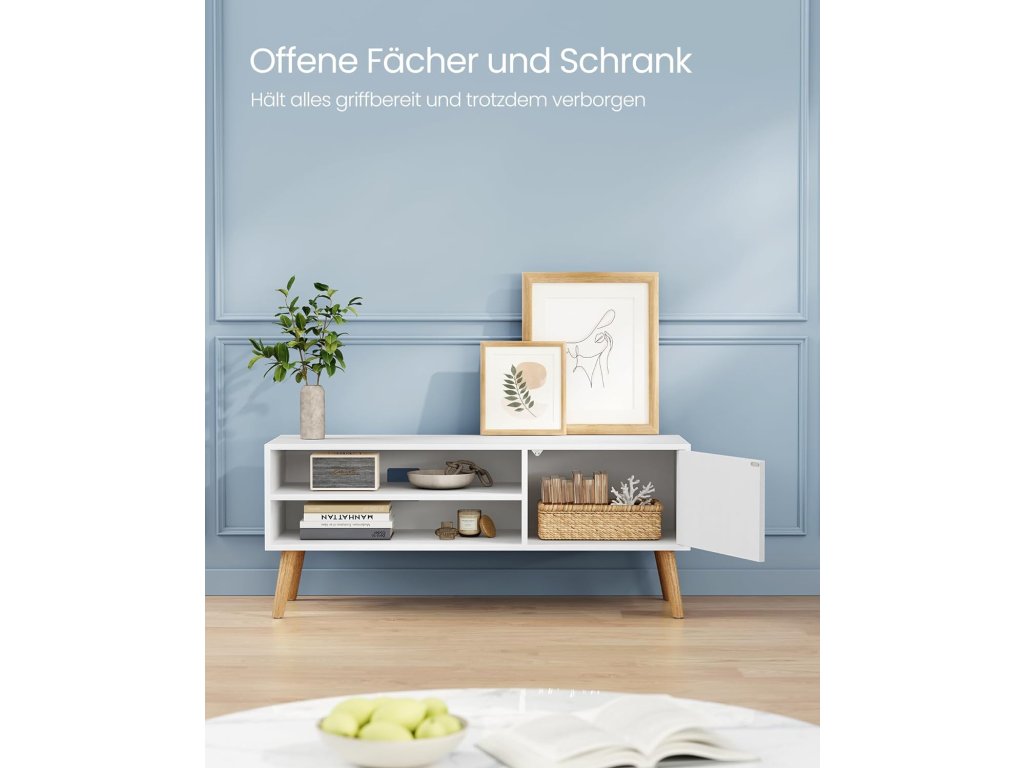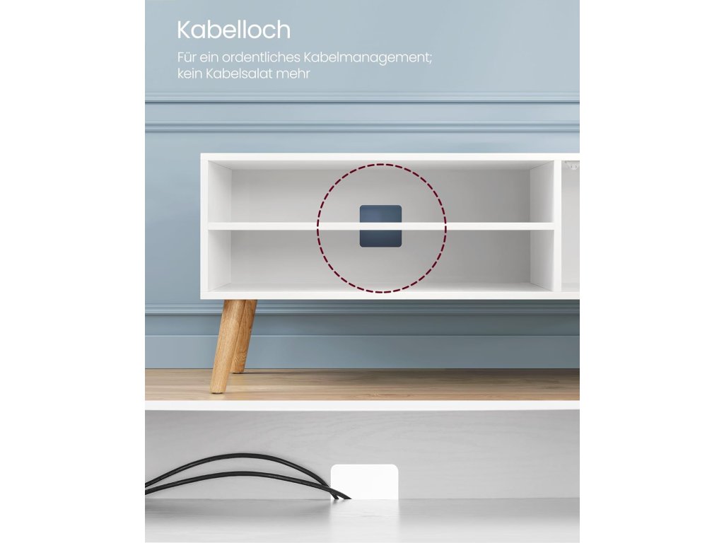 120 cm dlouhá deska stolu, 2 otevřené přihrádky ve spodní části a skříňka s dvířky - zde najdou vhodné místo vaše dálkové ovladače a herní konzole. Tento stolek lze harmonicky začlenit do různých stylů interiéru. Vysoce kvalitní dřevotřísková deska a robustní nohy z gumovníkového dřeva zajišťují vysokou stabilitu; tato skříňka pod televizor unese až 100 kg. Díky otvorům v zadním panelu můžete přehledně uspořádat kabely. Vytvořte si uklizený prostor pro televizor a užívejte si minimalistickou krásu tohoto televizního stolku. Tento televizní stolek se šikmými nohami a bílou povrchovou úpravou dodá vašemu obývacímu pokoji elegantní nádech.