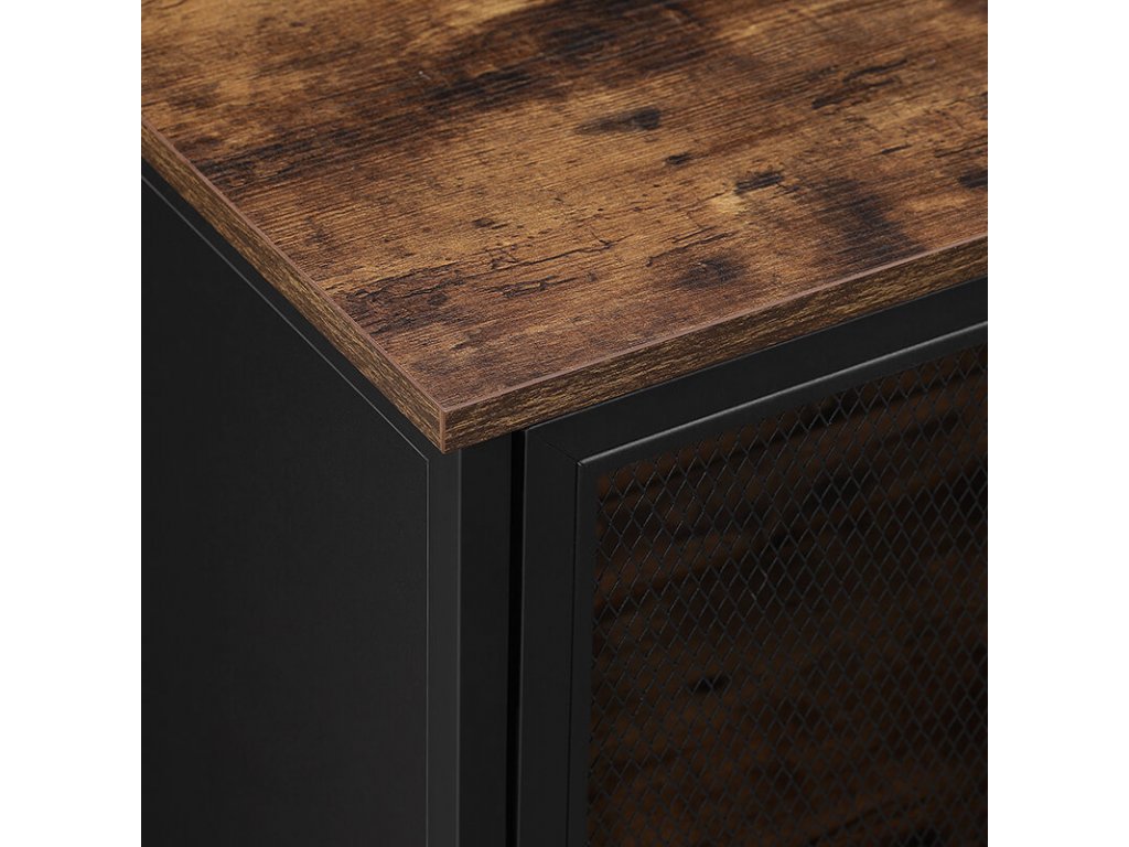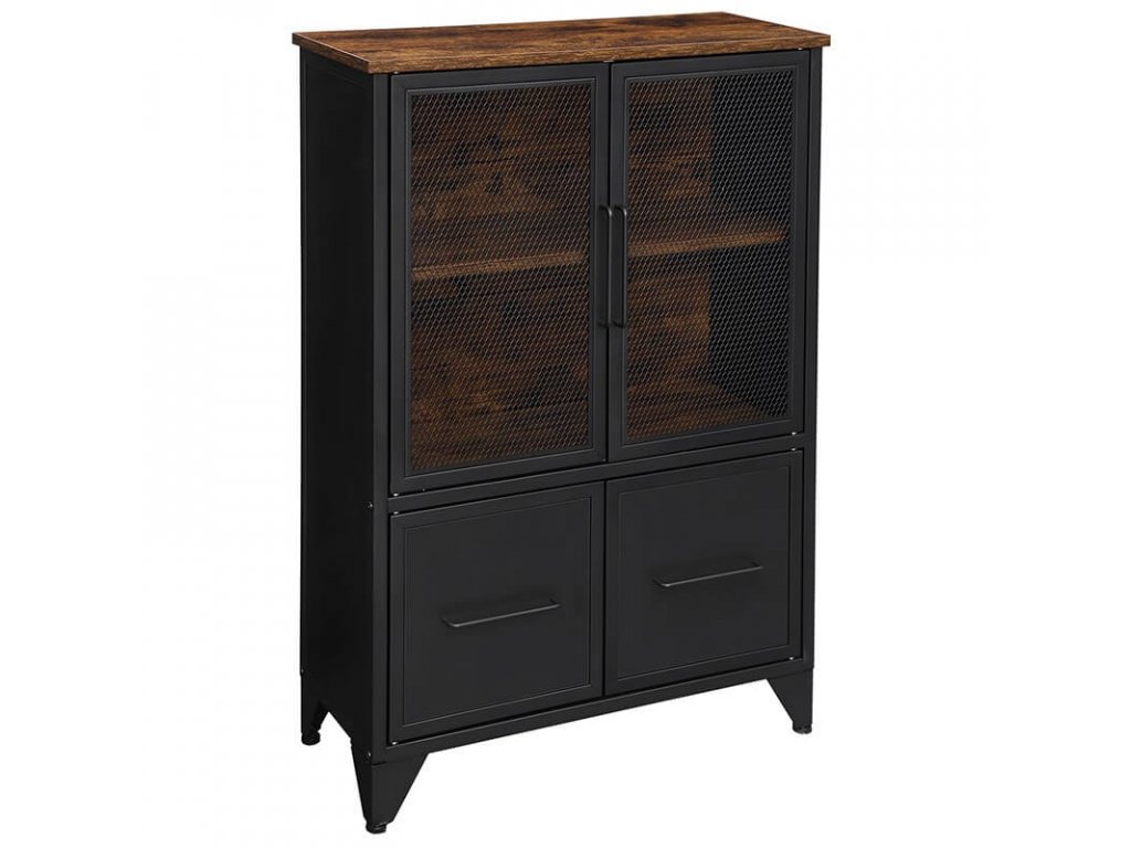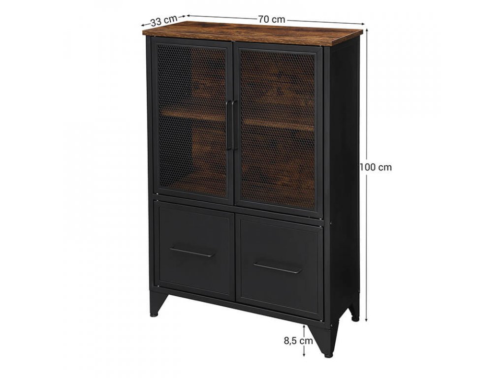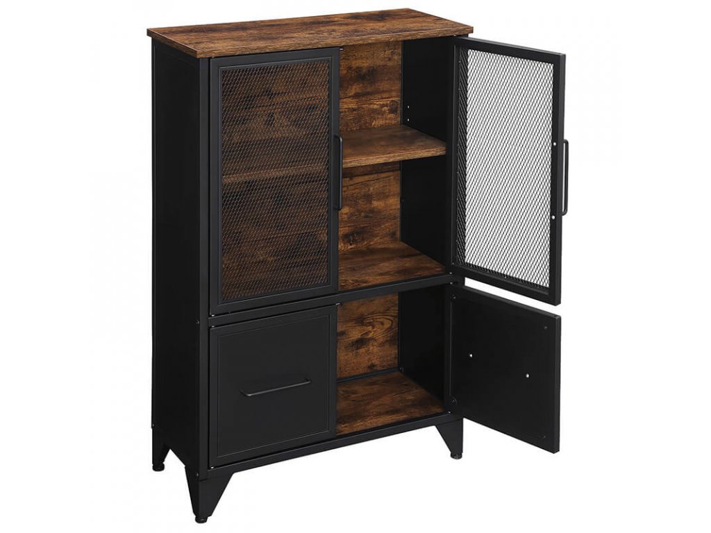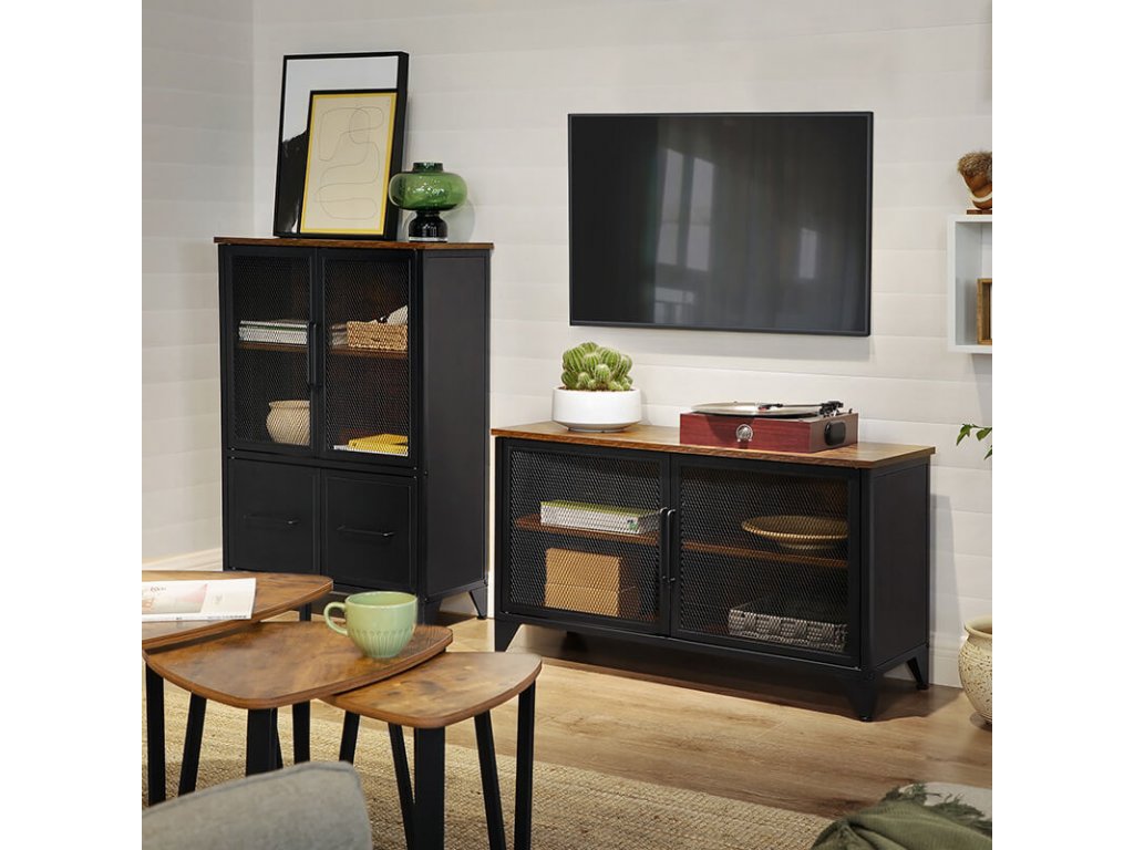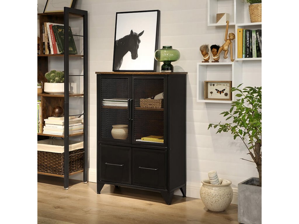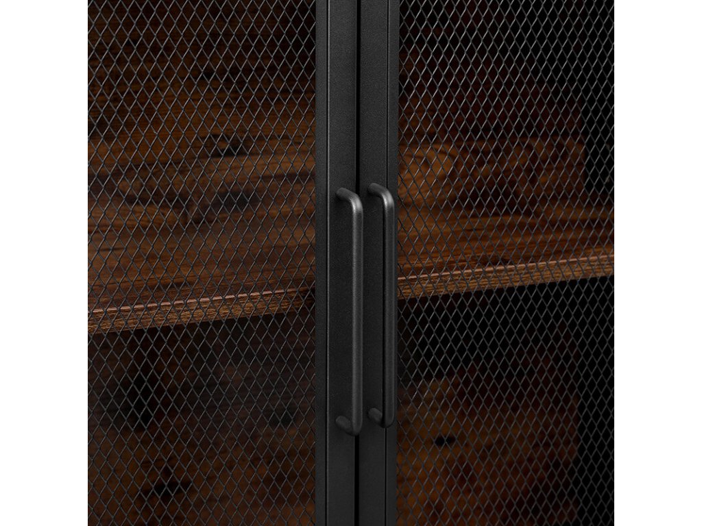 Na desku skříňky můžete umístit krásné vázy a obrazy a na dvě úložné police pod ním můžete uložit knihy a jiné dekorace. Vaše sbírka cenností uvnitř skříňky bude částečně skrytá a částečně viditelná za dvířky z kovové síťoviny v matné černé barvě, díky čemuž budou vypadat atraktivněji.