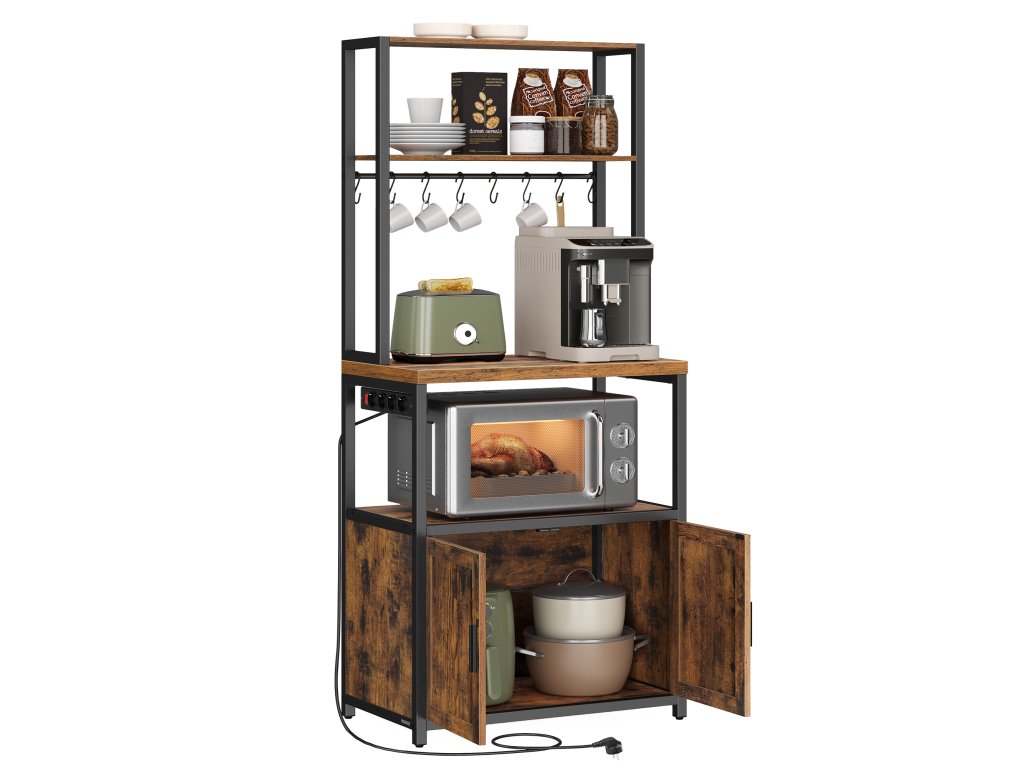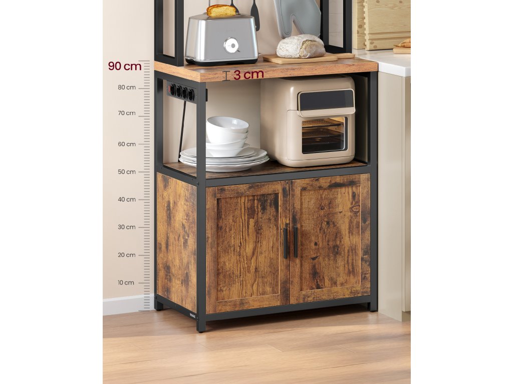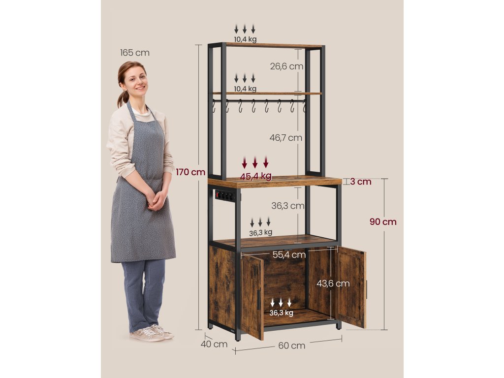 Silná pracovní deska, pohodlná výška: S tloušťkou 3 cm tato masivní pracovní deska odolá velké zátěži. Její výška 90 cm se dokonale shoduje s výškou pracovní desky, čímž se zabrání únavě zad. Prostorný úložný prostor: se 2 policemi nahoře na koření, 8 háčky na zavěšení šálků, velkým podnosem na kávovar, policí dole na mikrovlnnou troubu a velkou skříňkou na uložení fritézy a nádobí. Vestavěný prodlužovací kabel: Díky 4 zásuvkám, vypínači a ochraně proti přetížení umožňuje vestavěný prodlužovací kabel bezpečné připojení zařízení. Lze jej instalovat vlevo nebo vpravo v závislosti na uspořádání vaší kuchyně. Robustní, stabilní a bezpečná: tato skříňka je vyrobena z dřevotřísky a oceli, takže je pevná. Nastavitelné nožičky zajišťují její stabilitu na nerovném povrchu a sada proti převrácení poskytuje dodatečnou bezpečnost. Jednoduchá montáž: díky očíslovaným dílům a podrobnému návodu se tento kus nábytku snadno a rychle sestavuje. Barva: rustikálně hnědá, černá. Materiál: Dřevotříska, ocel. Rozměry: 60 x 40 x 170 cm. Hmotnost: 18,1 kg. Max. statická nosnost horní police: 10,4 kg. Max. statická nosnost pracovní desky: 45,4 kg. Max. statická nosnost spodní police a skříňky: 36,3 kg