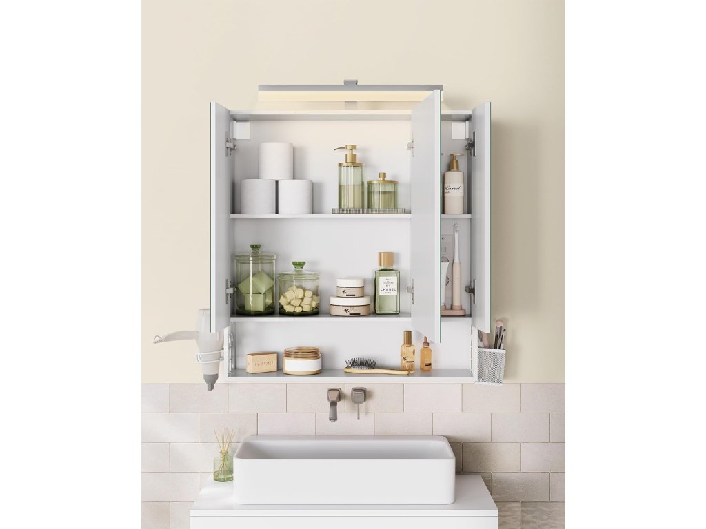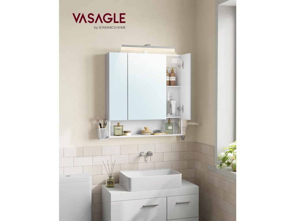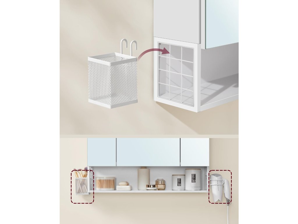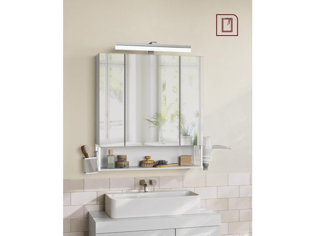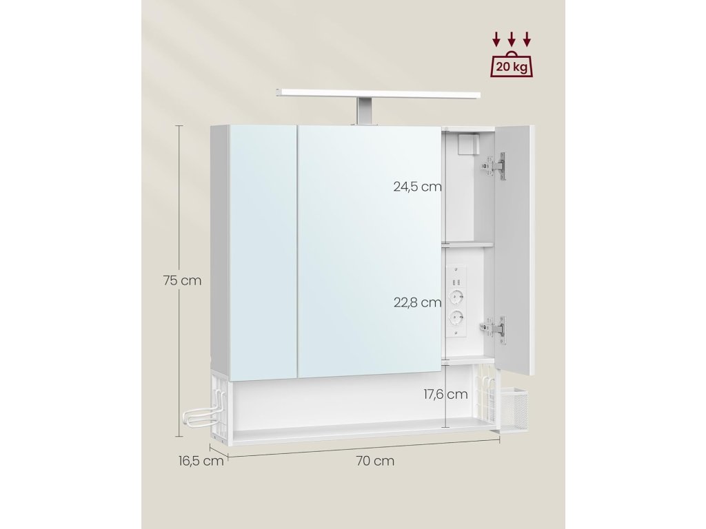 Díky praktickým 2 AC zásuvkám a 2 USB portům uvnitř skříňky lze nabíjet nebo připojovat fén, kulmu, elektrický zubní kartáček a holicí strojek. Jedna strana je vybavena malým závěsným košíkem, který je vhodný pro vaše drobnosti, a na druhé straně je držák na fén, který usnadňuje jeho používání. Horní část zrcadlové skříňky je vybavena světelným proužkem, který vám usnadňuje vidět se v zrcadle, abyste si mohli snadno dopřát každodenní péči o pleť a líčení. Schovejte svá tajemství za zrcadlovými dvířky, která nejen chrání vaše soukromí, ale také dodají vaší koupelně jednoduchou krásu. Otevřený prostor ve spodní části je praktický pro uložení vašich běžných věcí, abyste k nim měli kdykoli přístup. To vám přináší větší flexibilitu do života. Barva: nebesky bílá. Materiál: Dřevěná dřevotříska, MDF (středně silná dřevovláknitá deska), kov, skleněné zrcadlo. Rozměry: 70 x 16,5 x 75 cm. Hmotnost: 16 kg. Max. celkové statické zatížení: 20 kg