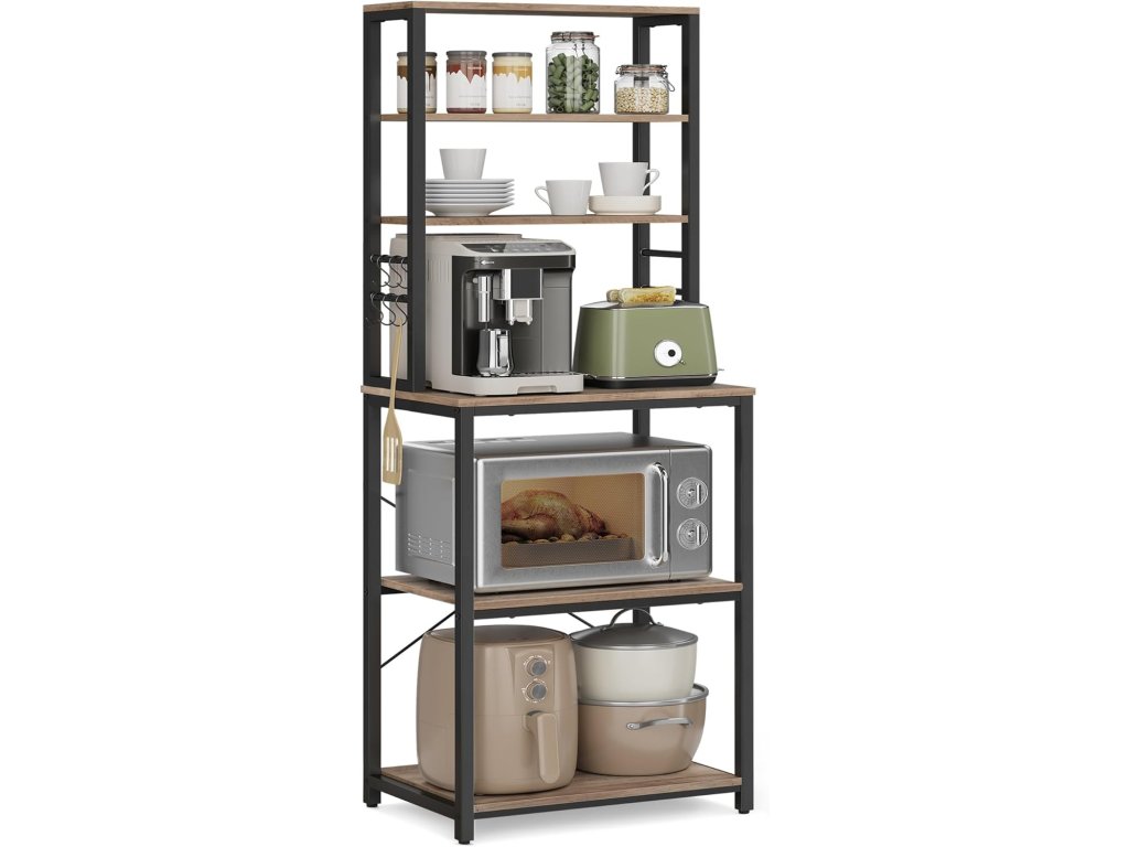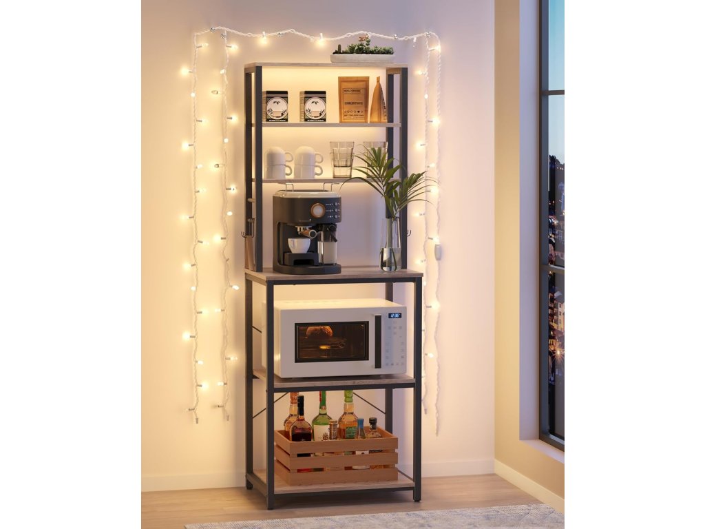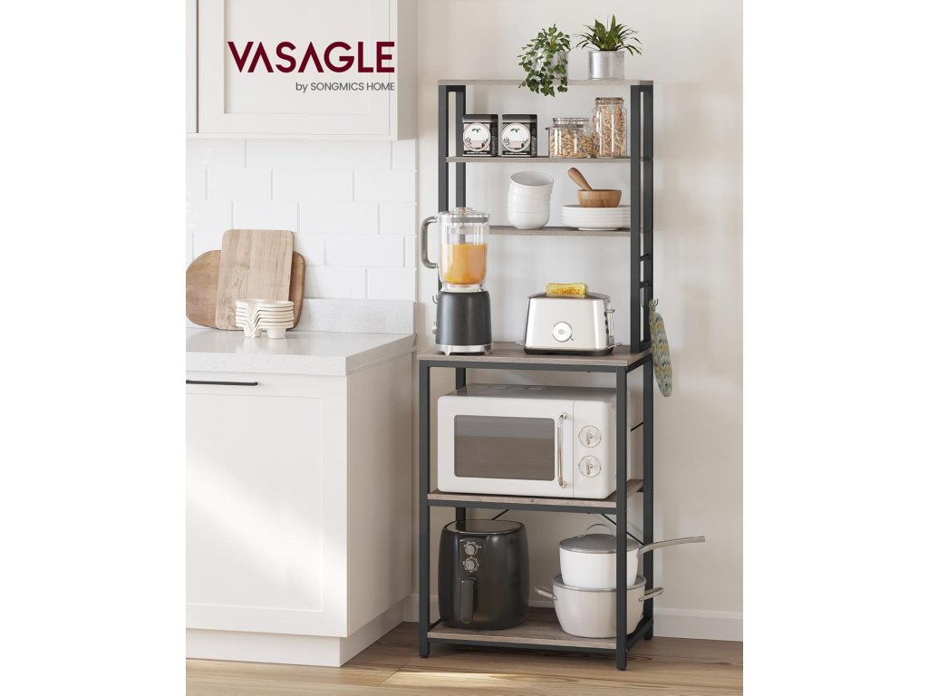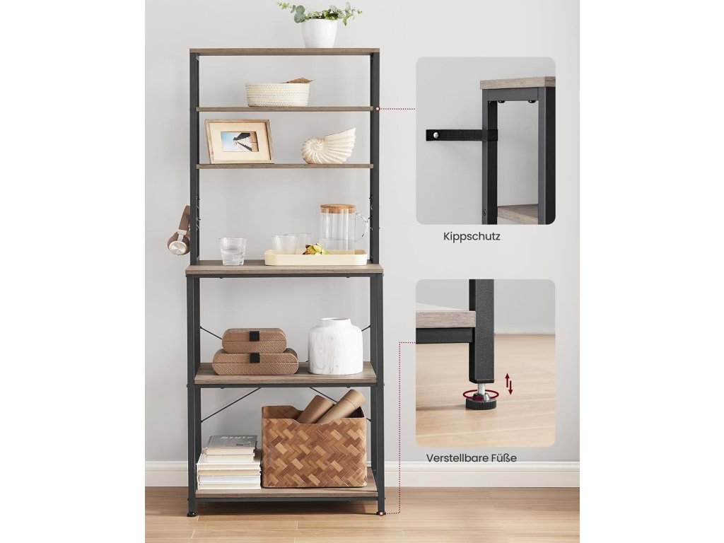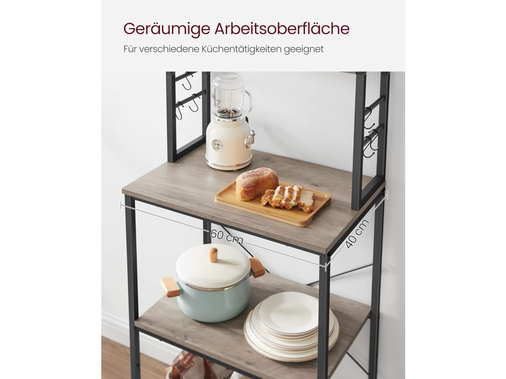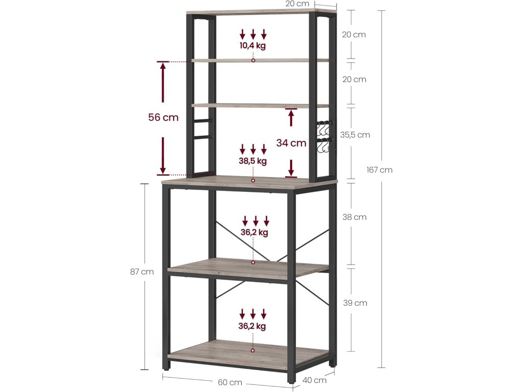 Popusťte uzdu své fantazii, objevte její všestrannost: Naše police není jen ideálním místem pro vaše kuchyňské poklady, ale může být také použita jako útulný koutek na kávu nebo jídelnu - perfektní doplněk vaší kuchyně. Střední police ve spodní části - výškově nastavitelná: tuto polici lze nastavit do 2 výšek, takže na ni můžete ukládat nádobí různých velikostí, od mixéru přes horkovzdušnou fritézu až po hrnce a pánve. Pevná konstrukce: díky kombinaci robustního ocelového rámu a odolné dřevotřísky je tato šedá police pevná, robustní a snadno vydrží vaši mikrovlnnou troubu, kávovar a další náčiní. Vhodné do malých prostor: s rozměry 40 x 60 x 167 cm je tato mikrovlnná police se 6 úrovněmi ideální do malých kuchyní. S touto úložnou policí můžete maximálně využít prostor. Stabilní a bezpečná: díky nastavitelným nohám stojí police vždy stabilně na podlaze a nezanechává žádné škrábance. Díky dodávané ochraně proti převrácení můžete polici připevnit na zeď, čímž zajistíte bezpečné prostředí pro vás a vaši rodinu. Nemusíte se starat o montáž: S pomocí jasného návodu, označených dílů a přiloženého montážního nástroje lze tuto kuchyňskou poličku sestavit raz dva. Barva: Šedohnědá, černá. Materiál: Dřevotříska, ocel. Rozměry: 60 x 40 x 167 cm. Hmotnost: 16,1 kg. Max. statická nosnost každé horní police: 10,4 kg. Max. statická nosnost prostřední pracovní plochy: 38,5 kg. Max. statická nosnost každé spodní police: 36,2 kg