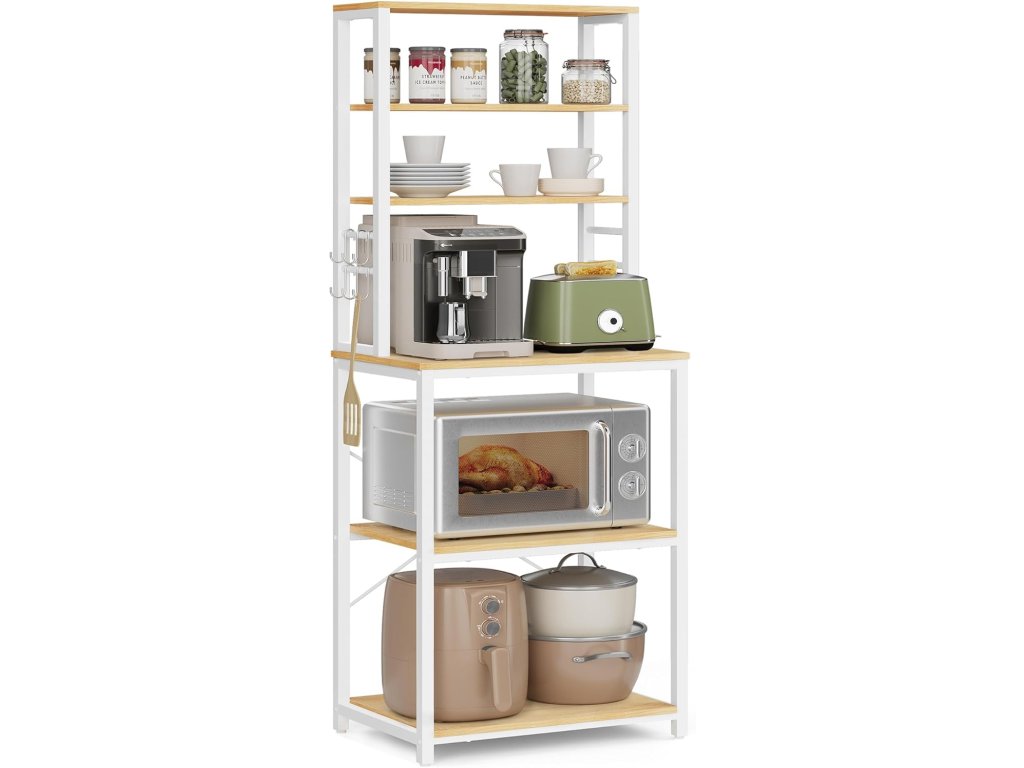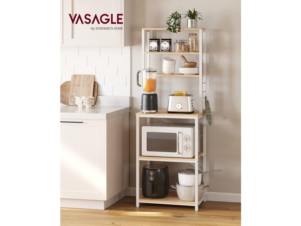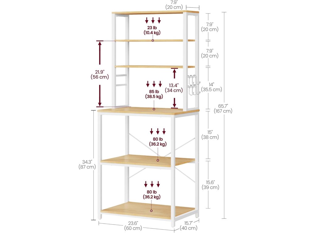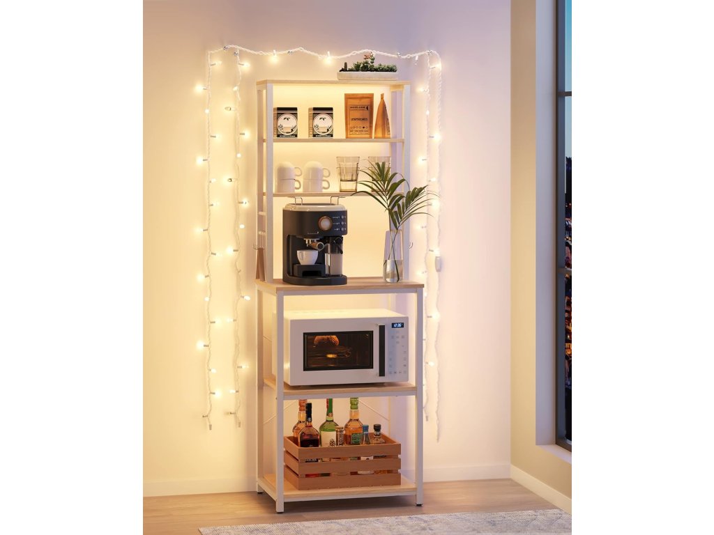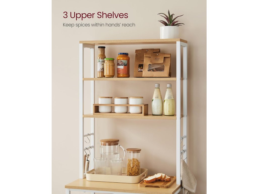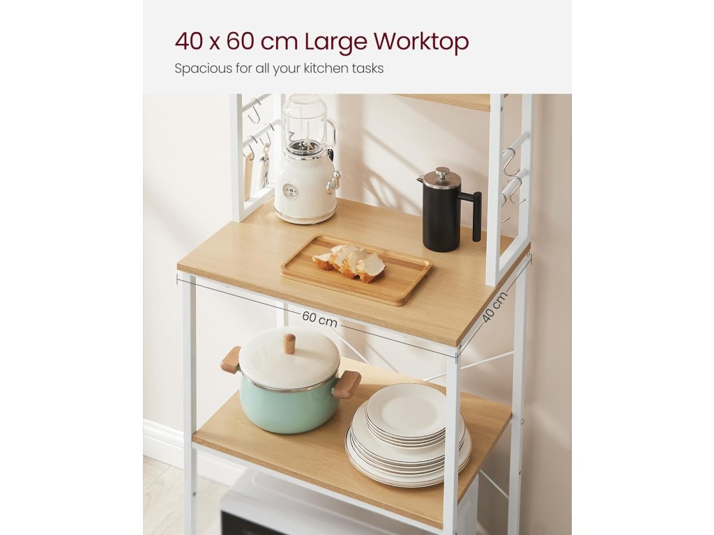 Uvolněte si místo na kuchyňské lince s tímto pekařským stojanem, který se pyšní spoustou úložného prostoru – 3 horní police na lahve, 3 velké spodní police na kuchyňské spotřebiče a 6 S-háčky na kuchyňské náčiní. Tento univerzální stojan zefektivní vaši kuchyň! Prostřední polici velkých spodních polic lze nastavit do 2 výšek, aby se na ni vešlo nádobí různých výšek, od mixéru a fritézy až po hrnce a pánve. Tento kuchyňský úložný regál, který kombinuje robustní ocelový rám s odolnou dřevotřískou, je pevný a pevný, aby pojal vaši mikrovlnnou troubu, kávovar a další příslušenství. Tato 6patrová kuchyňská police s rozměry 60 x 40 x 167 cm se perfektně hodí do kompaktních kuchyní nebo skvěle poslouží jako mini kavárna, která vám umožní plně využít váš prostor. Díky nastavitelným nohám může tato police vždy zůstat stabilní na podlaze, aniž by se poškrábala; díky dodávané sadě proti převrácení pro upevnění ke zdi nabízí klid, pokud máte děti nebo domácí mazlíčky. Barva: Dub, Bílá. Materiál: Dřevotříska, Ocel. Rozměry výrobku: 60 x 40 x 167 cm. Hmotnost výrobku: 16,1 kg. Max. statická nosnost každé horní police: 10,4 kg. Max. statická nosnost prostřední pracovní desky: 38,5 kg. Max. statická nosnost každé spodní police: 36,2 kg