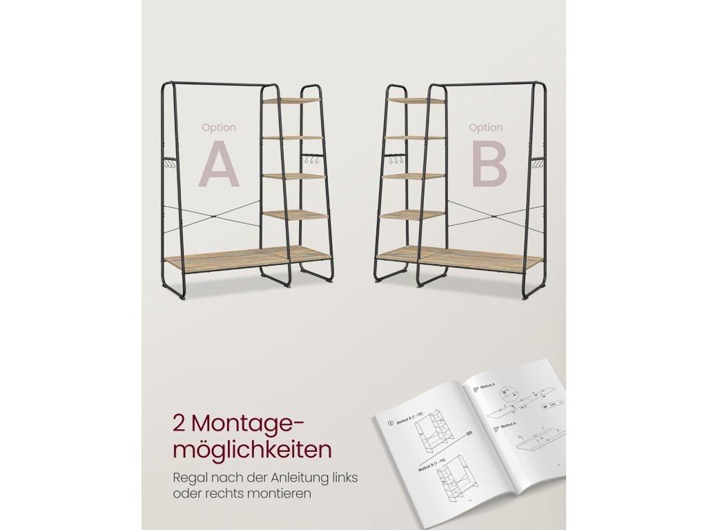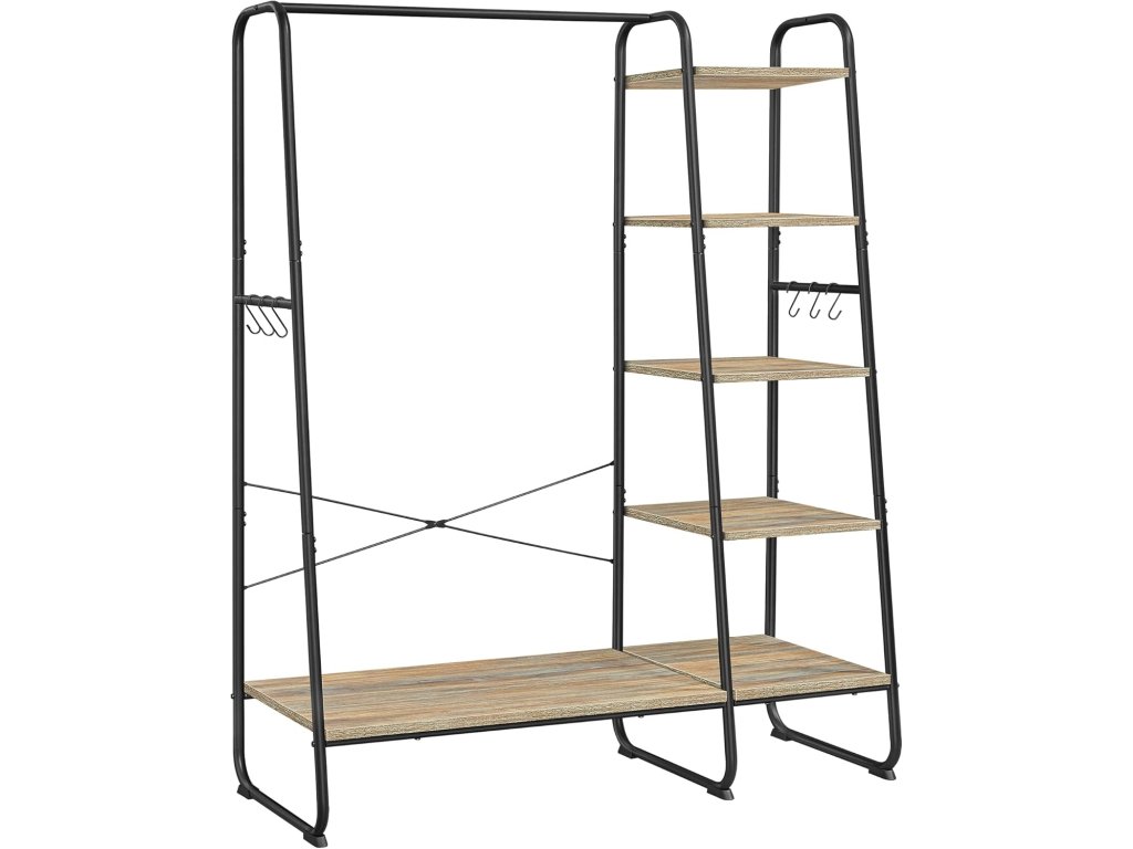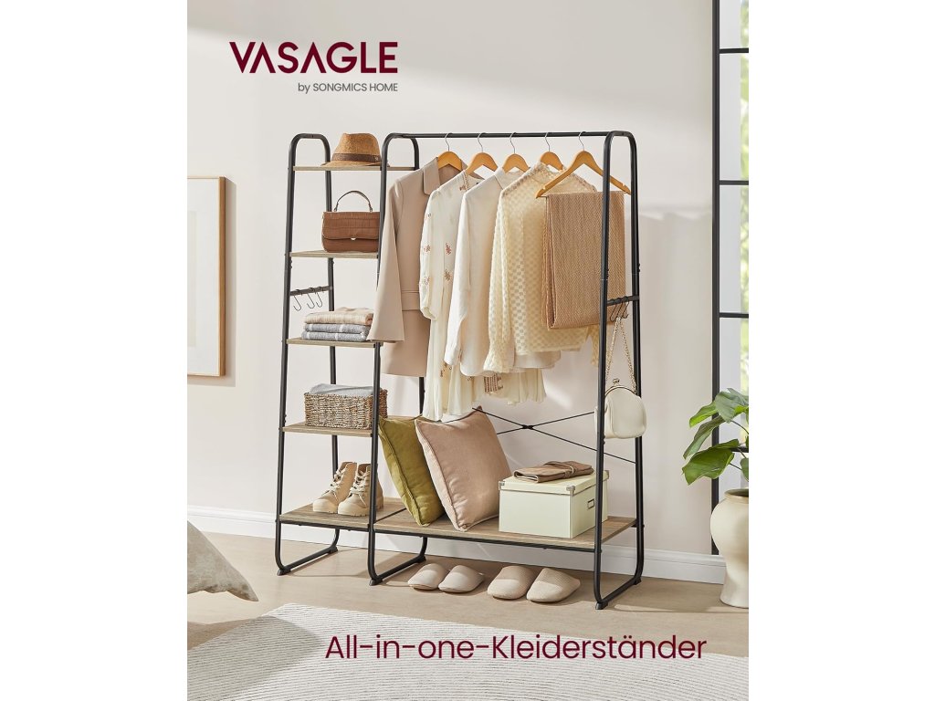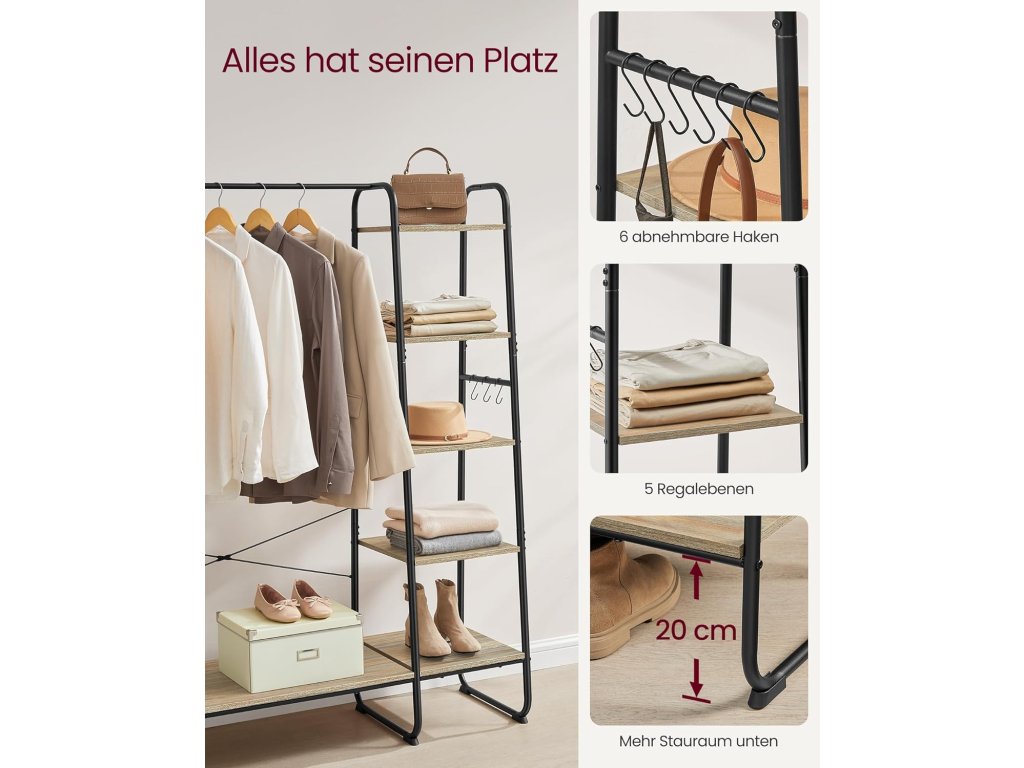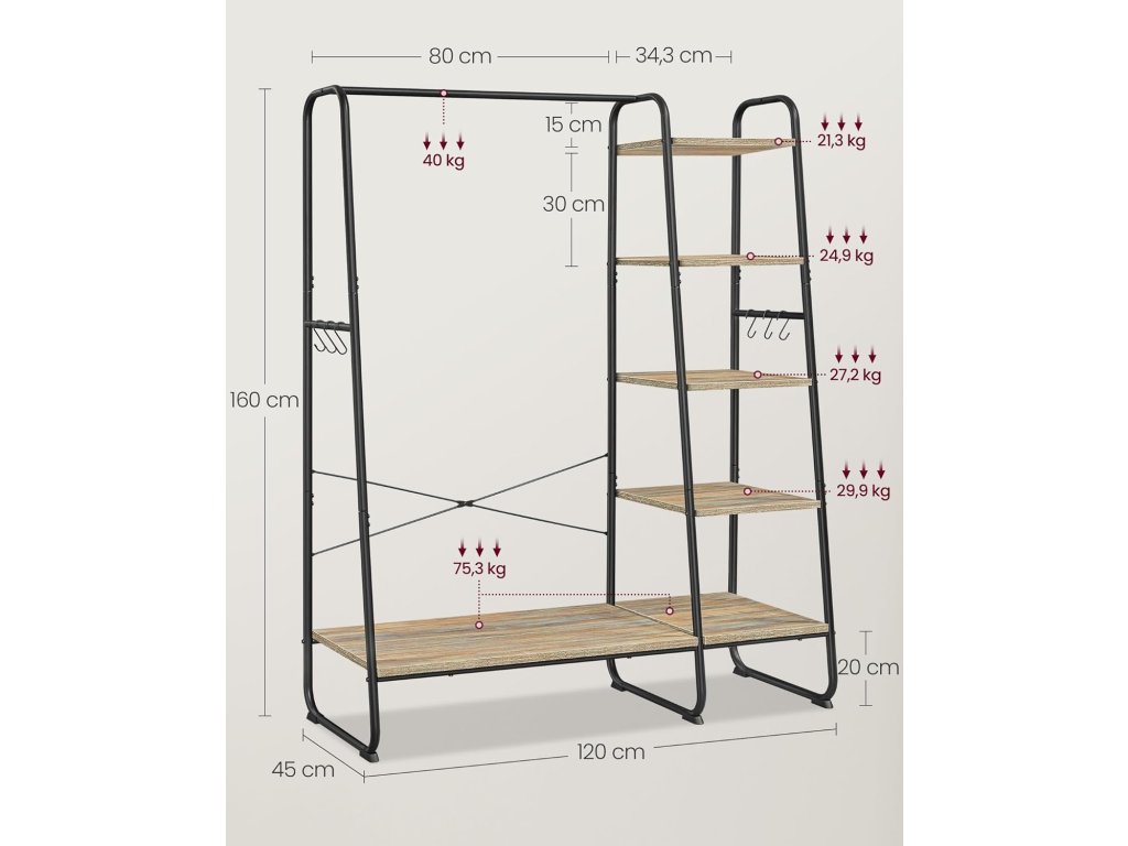 Tento věšák na oblečení kombinuje závěsnou tyč, poličku na boty, 5 úložných polic a 6 bočních háčků ve tvaru S v jednom, aby vašemu oblečení, botám, taškám, dekoracím a rostlinám poskytla perfektní místo. Tento věšák na oblečení o rozměrech 120 x 45 x 160 cm se pyšní spoustou úložného prostoru pro vaše věci a dostatečným vertikálním prostorem pro zavěšení dlouhých kabátů, což vám usnadní přípravu během hektických rán. Tento odolný šatní věšák s policí na boty je vyroben z kvalitní dřevotřísky a má robustní ocelový rám a unese celkovou nosnost až 220 kg, takže vám bude sloužit rok co rok. Navíc závěsná tyč s maximální nosností 40 kg snadno unese i vaše těžké kabáty! 5 úložných polic můžete nainstalovat na levou nebo pravou stranu šatní věšáku podle vašich potřeb a používat stojan v ložnici, chodbě, obývacím pokoji nebo kdekoli, kde potřebujete úložný prostor. Abyste si mohli připravit tento šatní stojan do ložnice, nemusíte být odborníkem na montáž. S pomocí očíslovaných dílů a srozumitelných pokynů zvládnete montáž bez problémů. Barva: černá, hnědá. Materiál: Dřevotříska, ocel. Rozměry výrobku: 120 x 45 x 160 cm. Hmotnost výrobku: 16,6 kg. Max. statická nosnost závěsné lišty: 40 kg. Max. statická nosnost každého háku: 4 kg. Max. statická nosnost každé úložné police (shora dolů): 21,3 kg, 24,9 kg, 27,2 kg, 29,9 kg, 75,3 kg. Celková max. statická nosnost: 220 kg