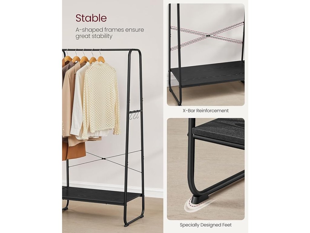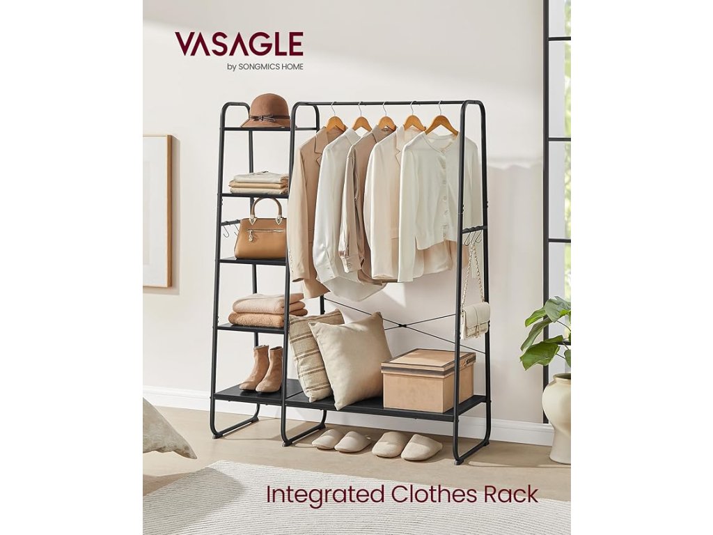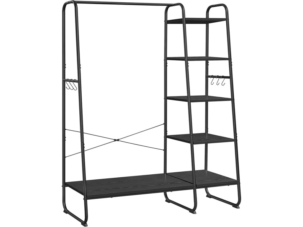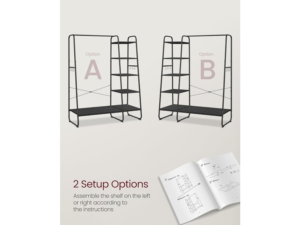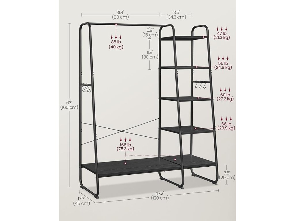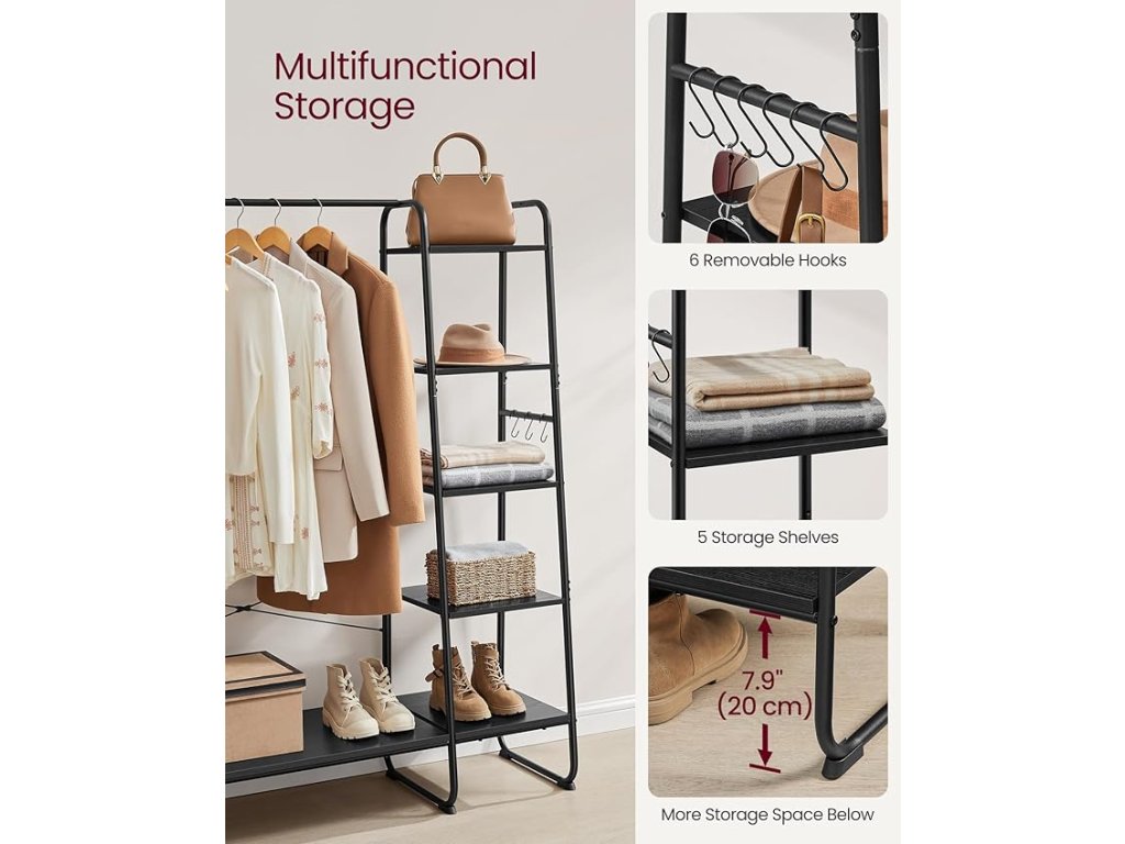 Tento věšák na oblečení kombinuje závěsnou tyč, poličku na boty, 5 úložných polic a 6 bočních háčků ve tvaru S v jednom, aby vašemu oblečení, botám, taškám, dekoracím a rostlinám poskytla perfektní místo. Tento věšák na oblečení o rozměrech 120 x 45 x 160 cm se pyšní spoustou úložného prostoru pro vaše věci a dostatečným vertikálním prostorem pro zavěšení dlouhých kabátů, což vám usnadní přípravu během hektických rán. Tento odolný šatní věšák s policí na boty je vyroben z kvalitní dřevotřísky a má robustní ocelový rám a unese celkovou nosnost až 220 kg, takže vám bude sloužit rok co rok. Navíc závěsná tyč s maximální nosností 40 kg snadno unese i vaše těžké kabáty! 5 úložných polic můžete nainstalovat na levou nebo pravou stranu šatní věšáku podle vašich potřeb a používat stojan v ložnici, chodbě, obývacím pokoji nebo kdekoli, kde potřebujete úložný prostor. Abyste si mohli připravit tento šatní stojan do ložnice, nemusíte být odborníkem na montáž. S pomocí očíslovaných dílů a srozumitelných pokynů zvládnete montáž bez problémů. Barva: Ebenově černá, matně černá. Materiál: Dřevotříska, ocel. Rozměry výrobku: 120 x 45 x 160 cm. Hmotnost výrobku: 16,6 kg. Max. statická nosnost závěsné lišty: 40 kg. Max. statická nosnost každého háku: 4 kg. Max. statická nosnost každé úložné police (shora dolů): 21,3 kg, 24,9 kg, 27,2 kg, 29,9 kg, 75,3 kg. Celková max. statická nosnost: 220 kg