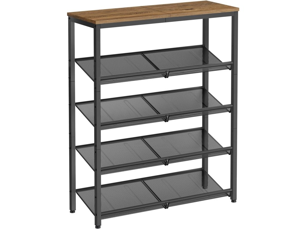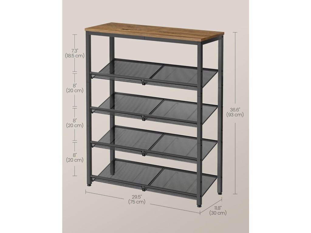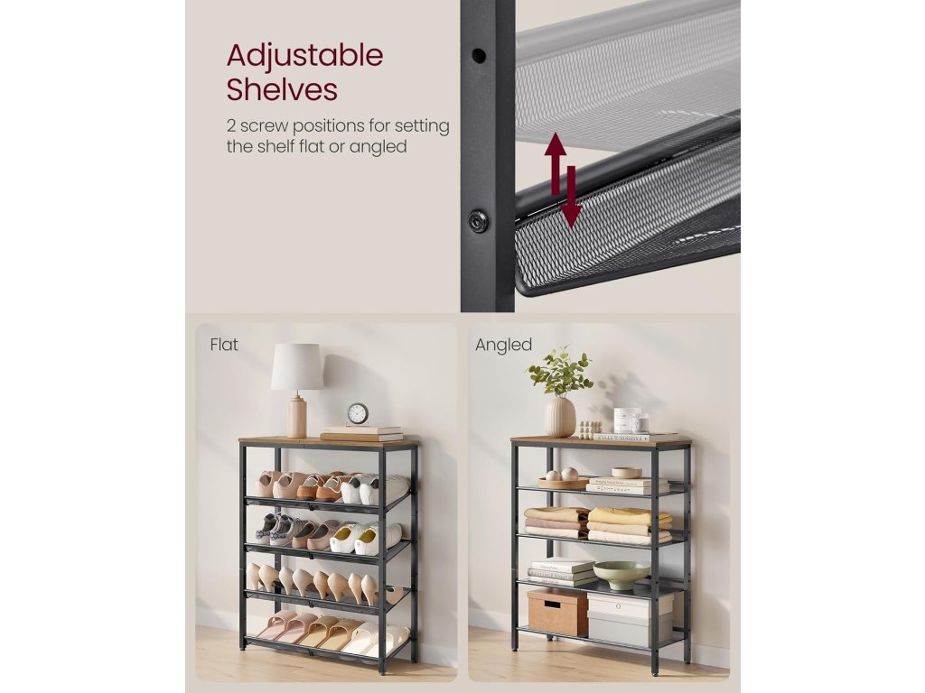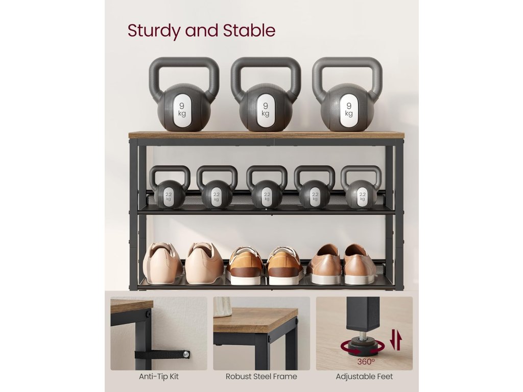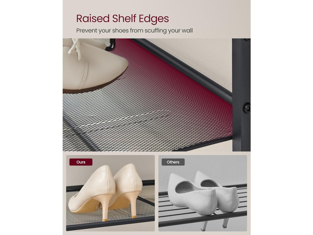S maximální nosností 27 kg na horní ploše na tento botník můžete umístit tašky, fotky, knihy a dekorace. S maximální nosností 11 kg na každou polici sem můžete umístit všechny vaše boty. Nastavitelné síťované police, ocelový rám