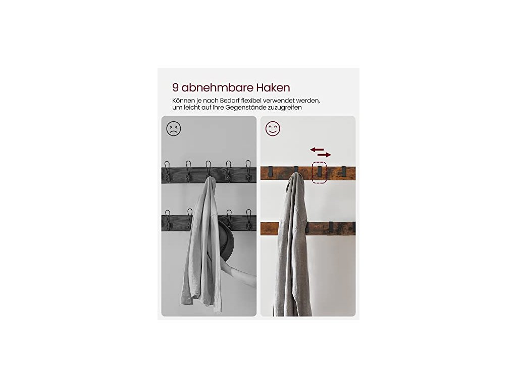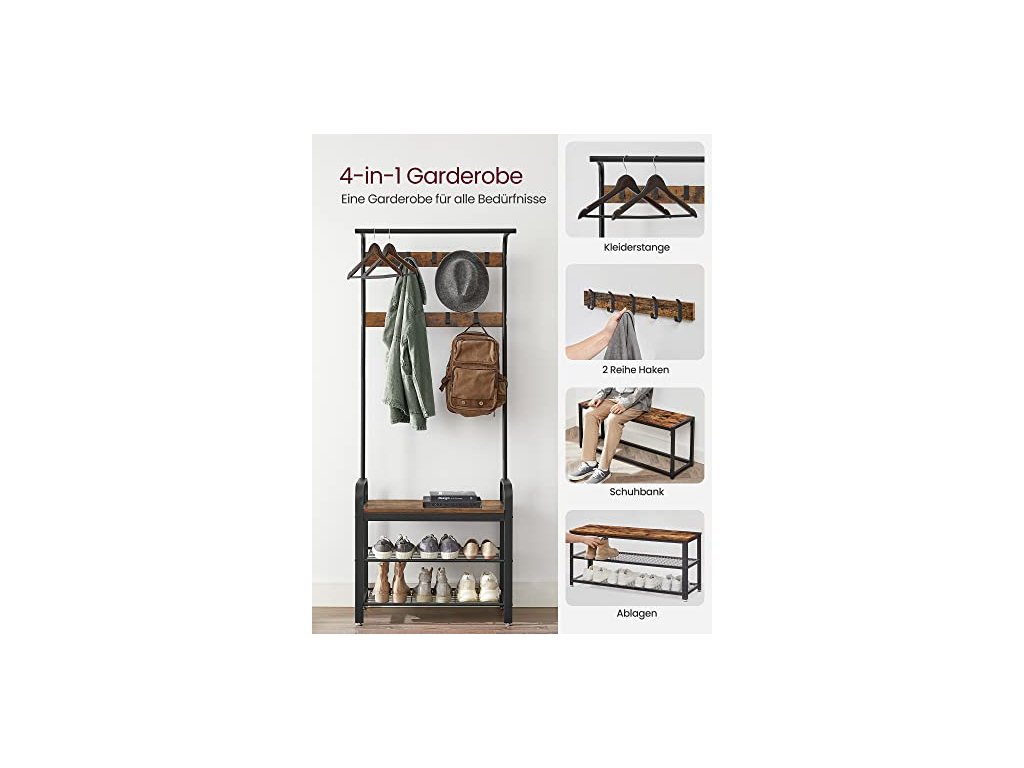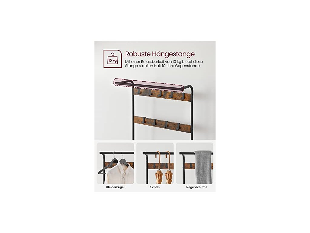 Stojan na kabáty s lavicí na boty, design 4 v 1, 9 odnímatelných háčků, tyč na oblečení. Pevná a stabilní horní lišta na oděvy tohoto stojanu na kabáty maximalizuje vertikální prostor a umožňuje zavěsit šály a deštníky nebo přidat ramínka pro zavěšení dalších oděvů.