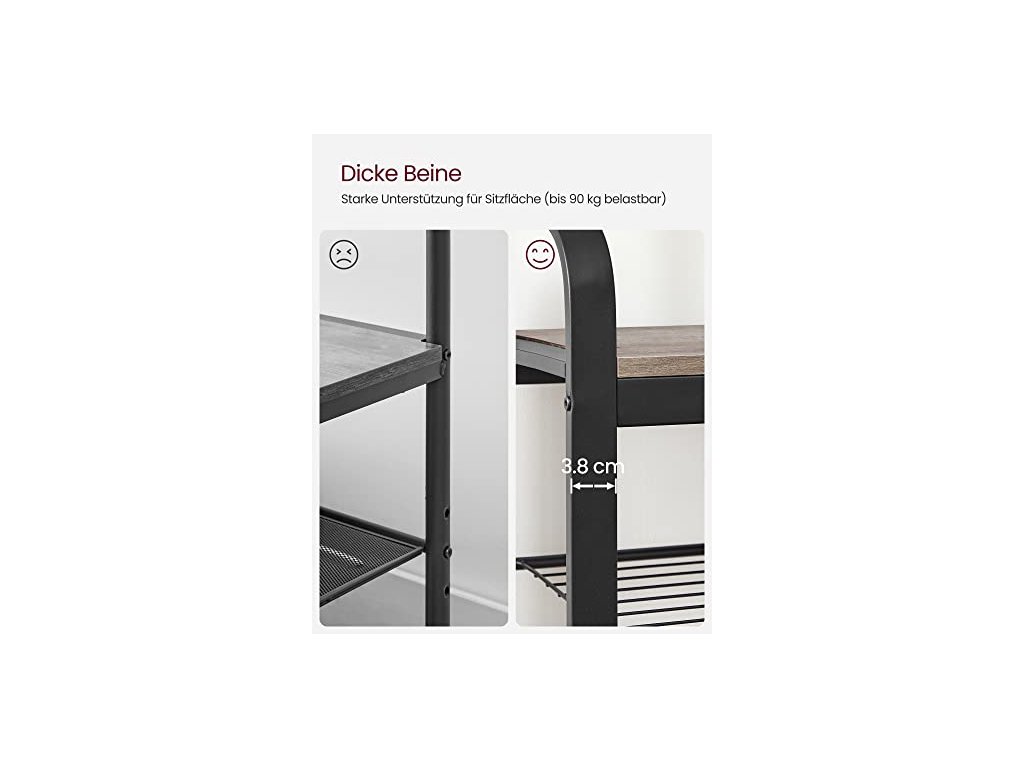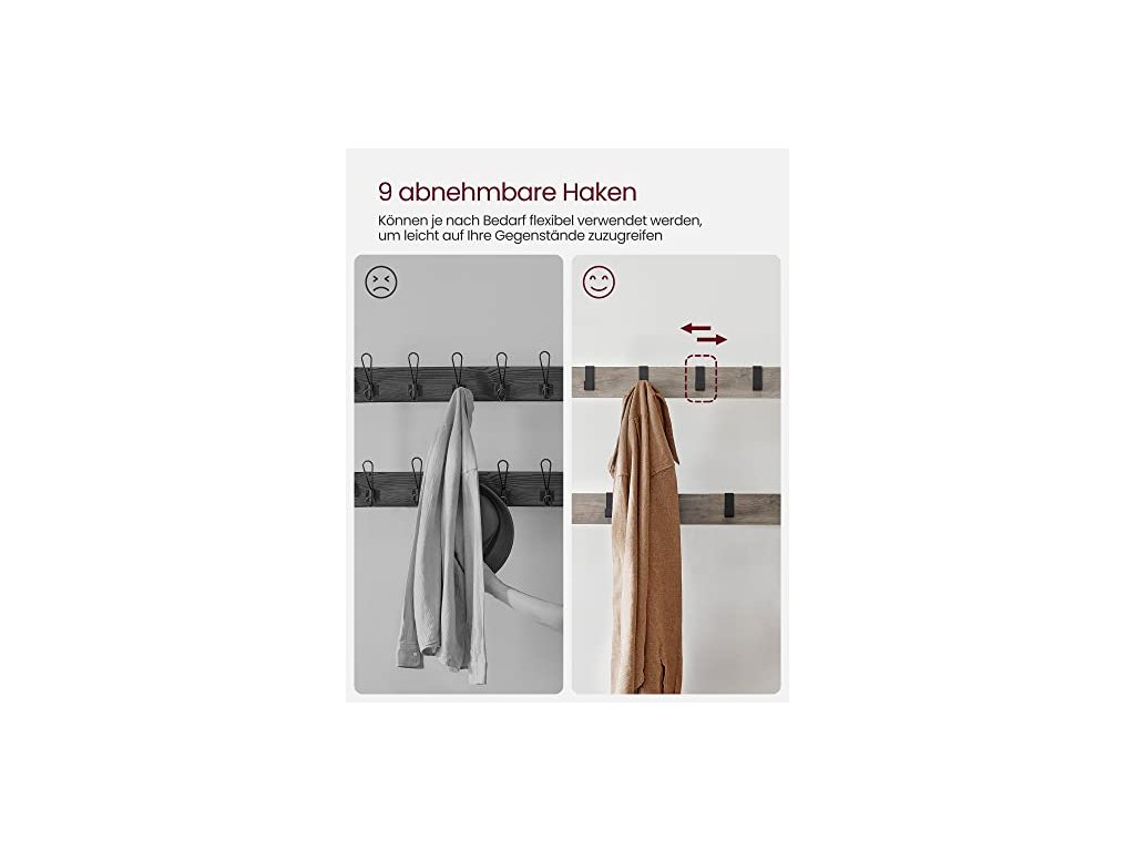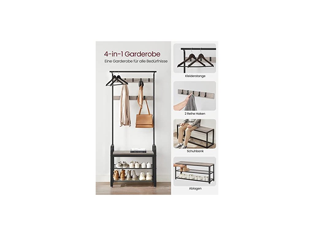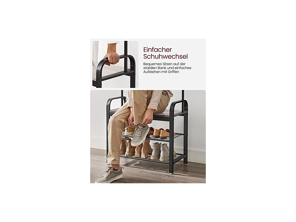 Stojan na kabáty s lavicí na boty, design 4 v 1, 9 odnímatelných háčků, tyč na oblečení. Pevná a stabilní horní lišta na oděvy tohoto stojanu na kabáty maximalizuje vertikální prostor a umožňuje zavěsit šály a deštníky nebo přidat ramínka pro zavěšení dalších oděvů.