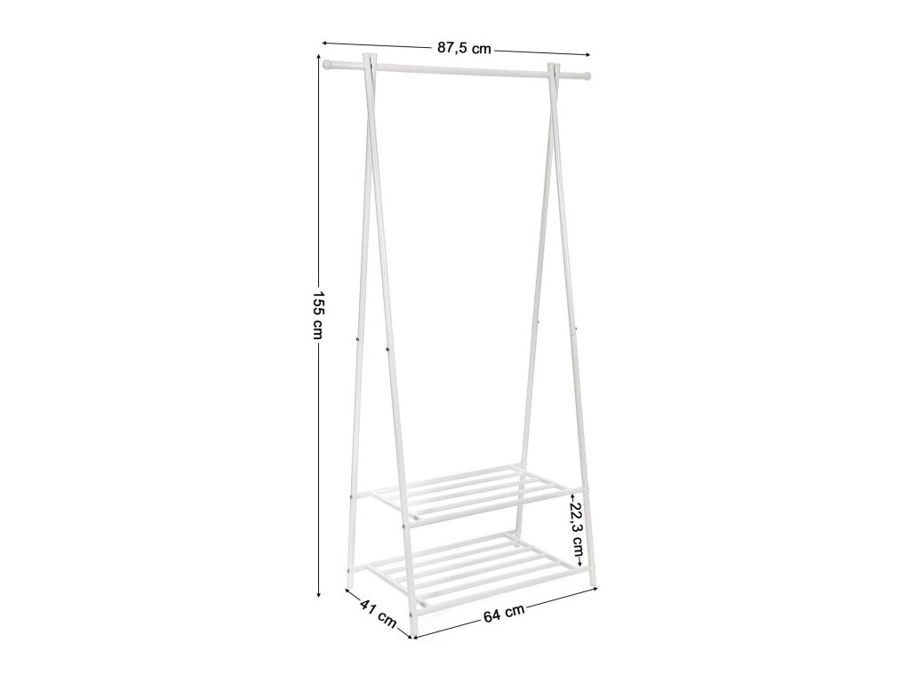 Nemáte šatní skříň? Žádný problém! Tento stylový věšák na kabáty udrží vaše hedvábné halenky a koktejlové šaty pověšené místo v krabicích – skvělá volba do vašeho loftového bytu, půdy nebo prádelny. Montáž by neměla být otravným úkolem – s imbusovým klíčem a podrobným ilustrovaným návodem, který je součástí balení, budete mít tento věšák na oblečení smontovaný dříve, než se nadějete. Tento unikátní rám z bílé litiny ve tvaru A, podepřený dvoupatrovými policemi, s boky mírně zužujícími se směrem nahoru poskytuje extra stabilitu a zároveň dodává vašemu prostoru nádech moderního minimalismu. Max. nosnost tyče: 20 kg, můžete plně využít prostor svého domova pověšením oblečení, klobouků, kravat; 2 police unesou každá 25 kg, což poskytuje více prostoru pro uložení bot, barevných úložných krabic a dalších věcí, které máte rádi. Praktický a elegantní věšák na kabáty pro maximální využití prostoru a návod k jeho snadné montáži. Barva: Bílá. Materiál: Železné trubky. Rozměry: 87,5 x 41 x 155 cm. Čistá hmotnost: 4,1 kg. Nosnost tyče: 20 kg. Nosnost každé police: 25 kg