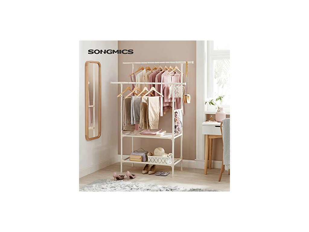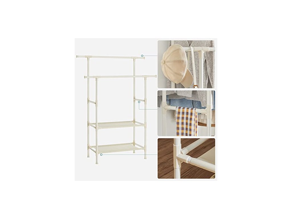 PRO LEHČÍ ŽIVOT: Po návratu domů z náročného pracovního dne nechcete strávit příliš mnoho času sestavováním tohoto stojanu na oblečení. Díky tomu, že nepotřebujete žádné nářadí, jej sestavíte během chvilky a bez větší námahy. Kovový věšák na oděvy má 2 závěsné lišty a 2 úložné police.