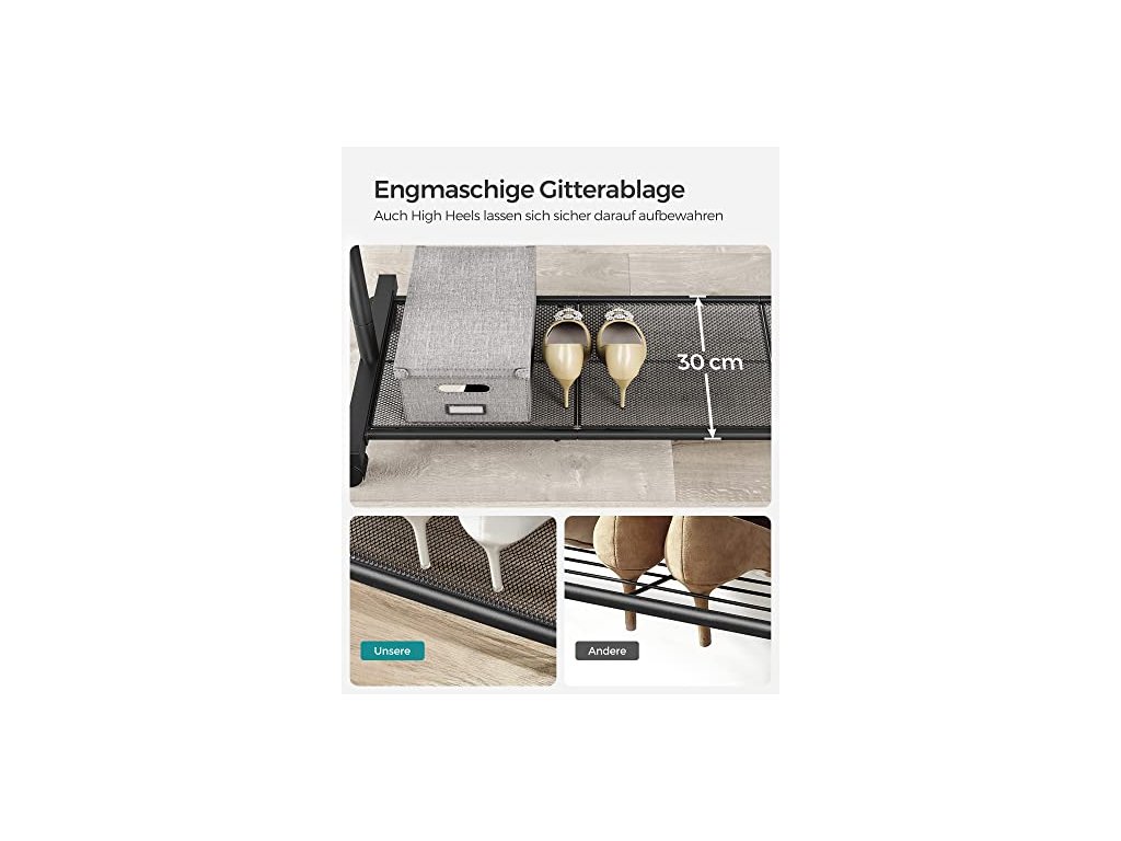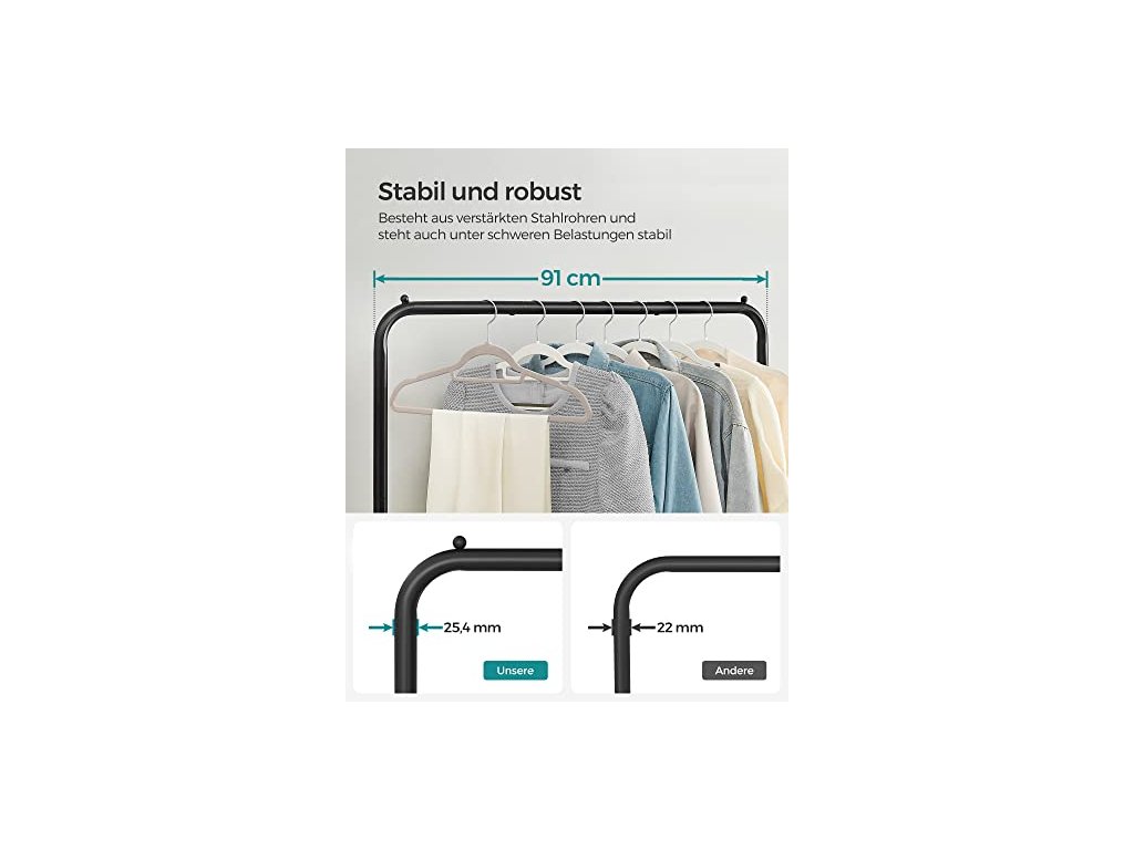 Na rozdíl od stojanů s běžnou zacvakávací konstrukcí jsou robustní ocelové trubky tohoto stojanu na oděvy spojeny šrouby, což zajišťuje vyšší stabilitu a velkou nosnost - horní lišta unese až 40 kg. Věšák má spodní polici