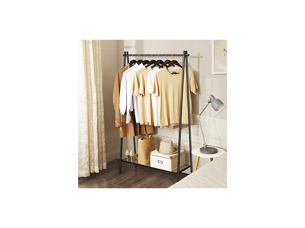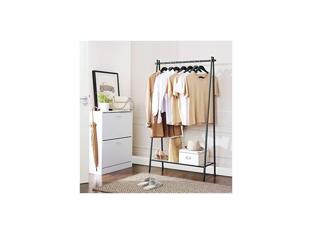 Tento prostorný věšák je vyroben z robustní oceli se stabilní konstrukcí ve tvaru A a nabízí závěsnou lištu na kabáty a šaty (až 40 kg) a spodní síťovanou polici na boty, krabice a další věci (až 15 kg).