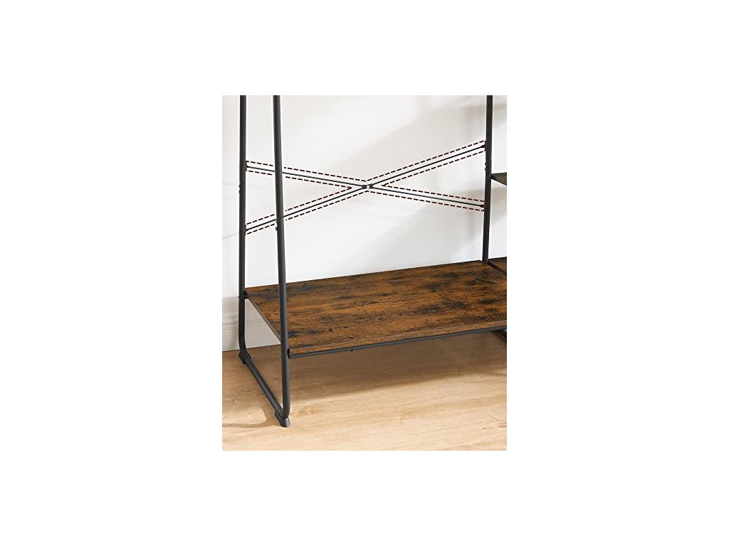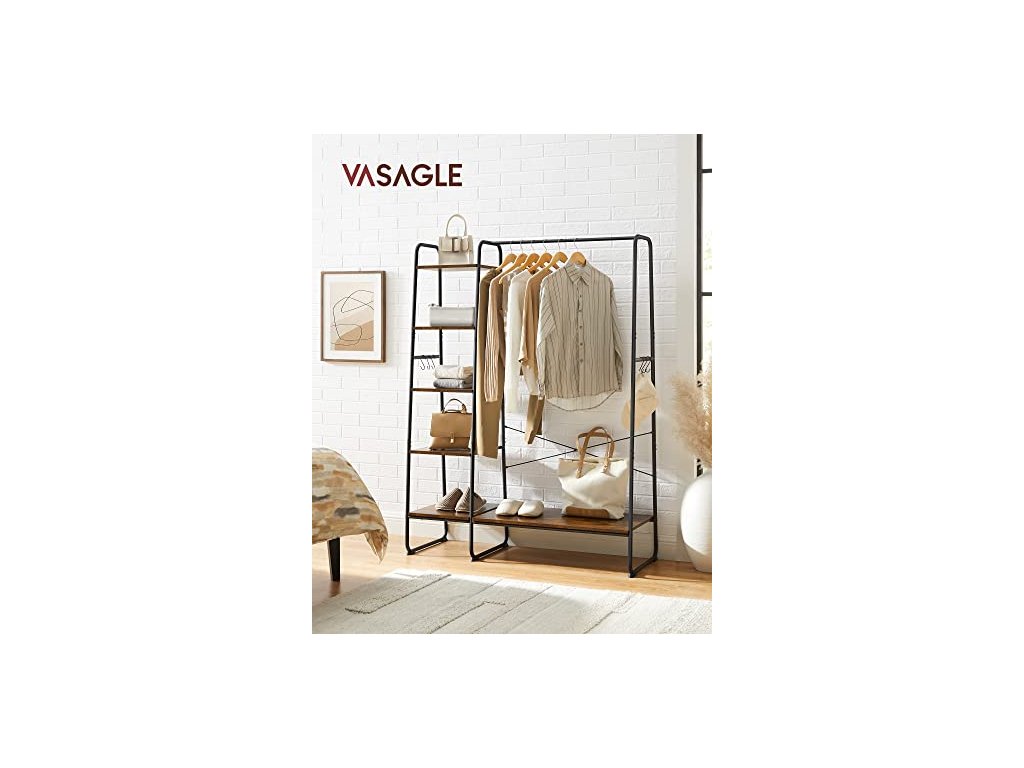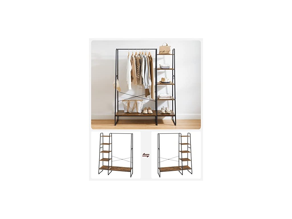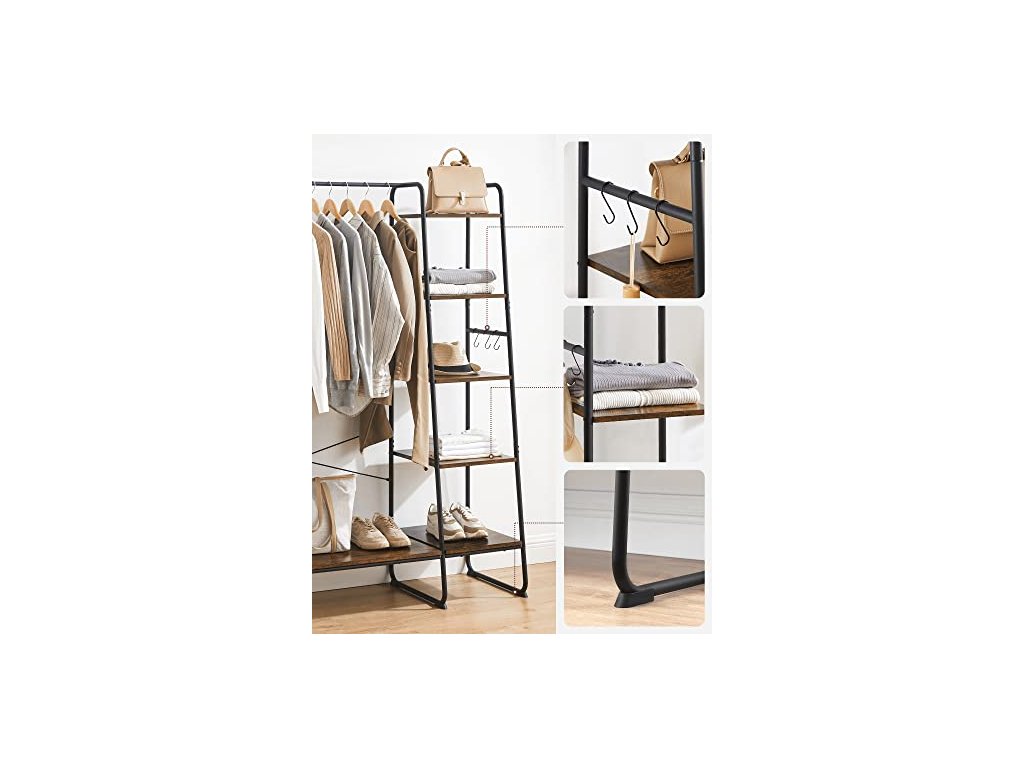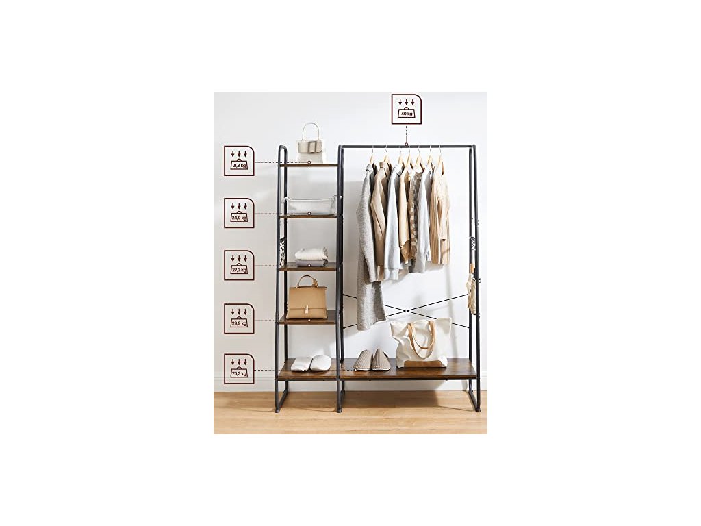 Univerzální věšák na oblečení. Kolejnice na bundy nebo košile, 6 polic na tašky, krabice nebo rostliny, boční kolejnice se 6 odnímatelnými háčky na klobouky nebo doplňky, další úložný prostor ve spodní části na boty. Tento velký věšák o rozměrech 45 x 120 x 160 cm nabízí dostatek prostoru pro zavěšení i dlouhých kabátů. Díky otevřené konstrukci budete mít oblečení vždy po ruce, abyste se mohli rychle připravit k odchodu. Vysoce kvalitní dřevotřísková deska, masivní ocelové trubky - věšák do předsíně je robustní, odolný a pružný (celková nosnost až 220 kg). Rám ve tvaru písmene A, vzpěry X na zadní straně, speciálně tvarované nohy - pro vysokou stabilitu. Tato otevřená šatní skříň se skvěle hodí do ložnice, šatny nebo předsíně - v závislosti na vašich potřebách lze pětiúrovňovou polici připevnit na pravou nebo levou stranu věšáku na oblečení. Montáž - velmi jednoduchá: díky přehledně označeným dílům a srozumitelnému ilustrovanému návodu tento stojan na šaty snadno sestavíte.
