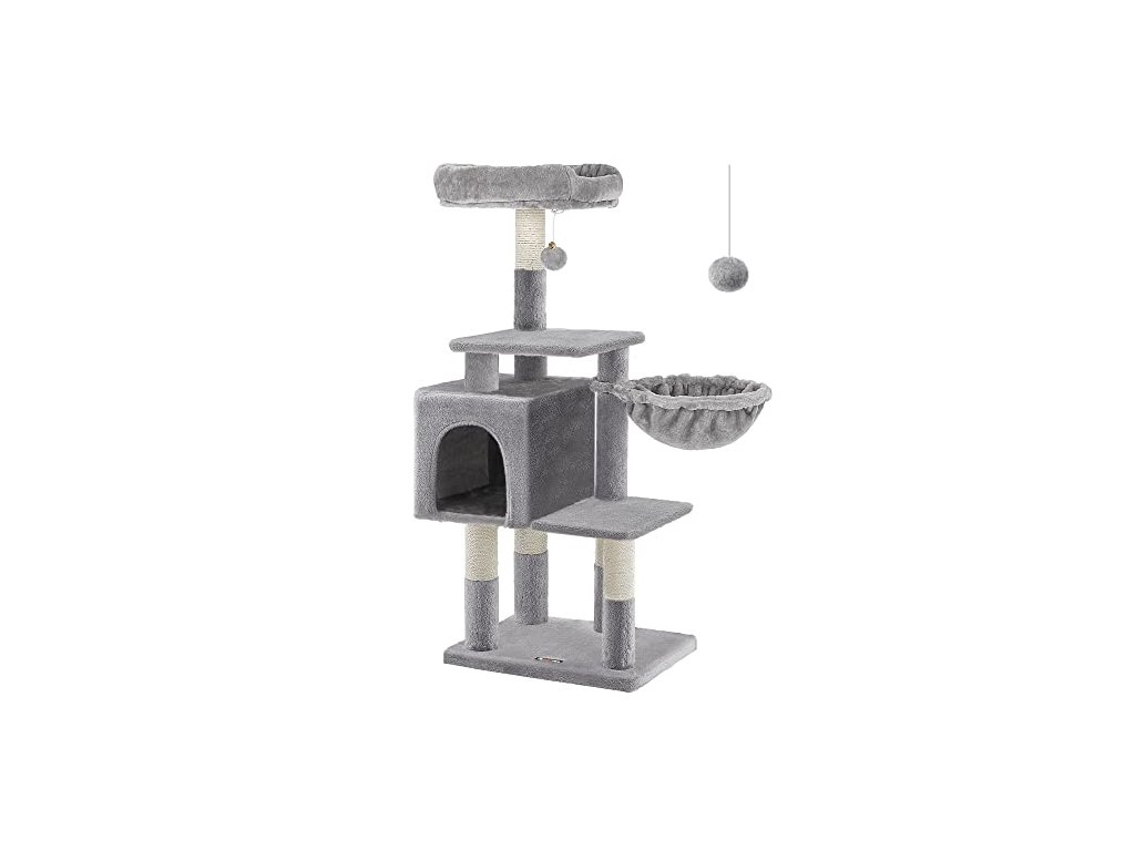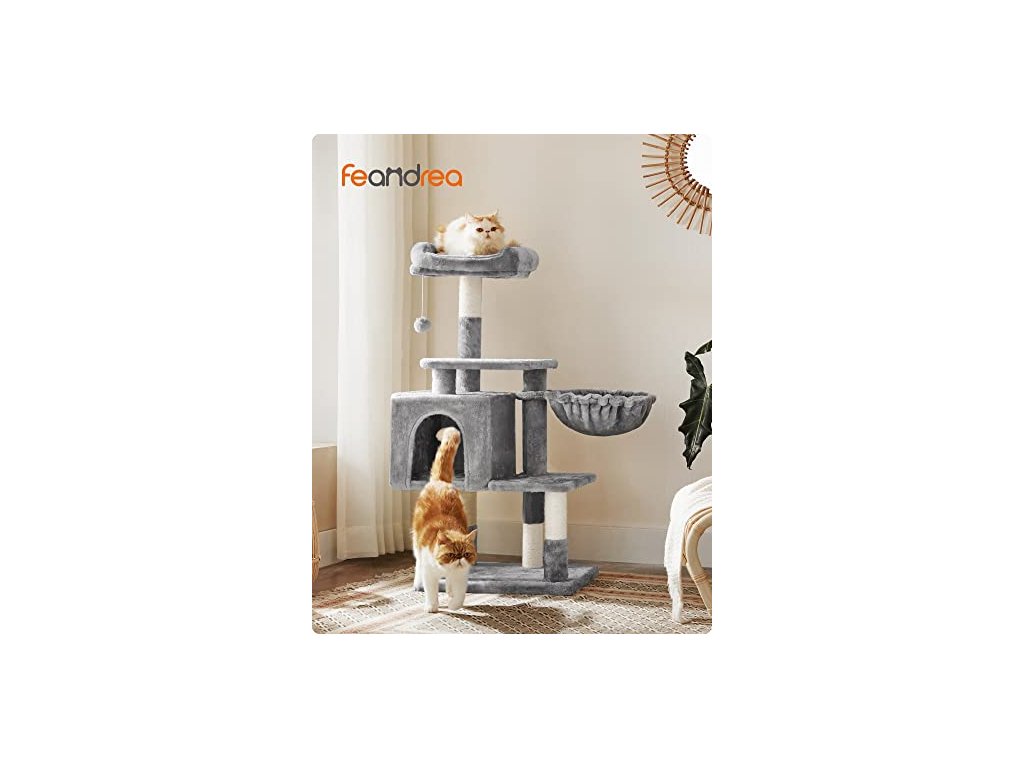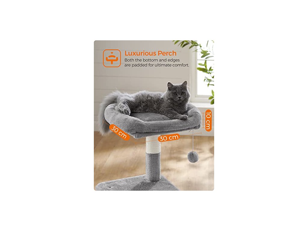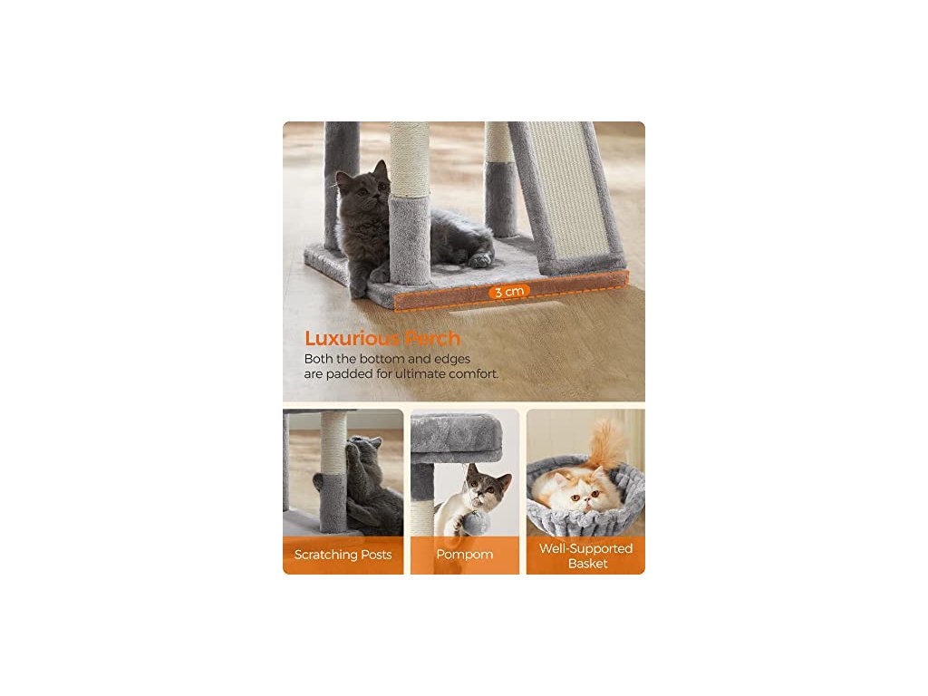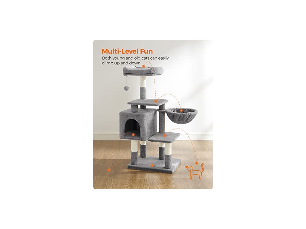 Horní polstrované sedátko je prostorný apartmán, spodní část je jejich šťastné hřiště. Po obědě se také mohou koupat na sluníčku, zdřímnout si na lehátku s košem nebo si užít "mňoukání" v soukromé jeskyni kočičí věže.