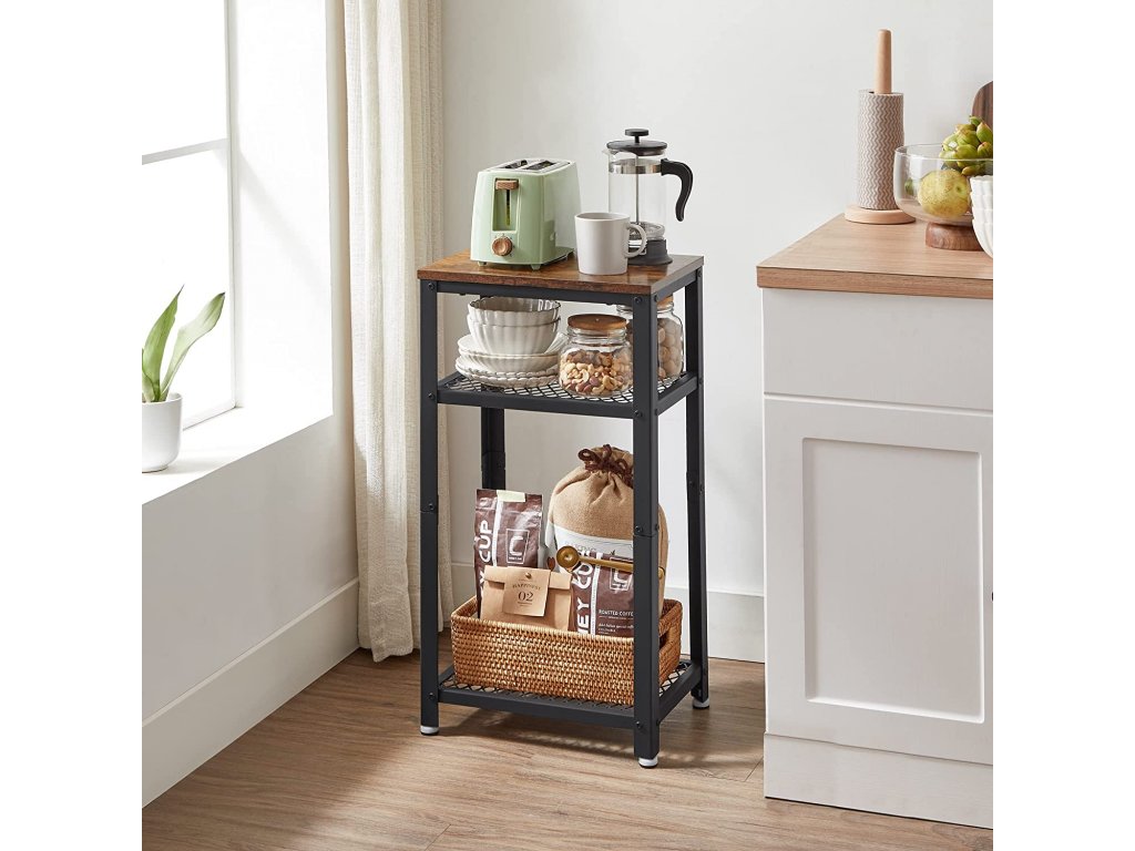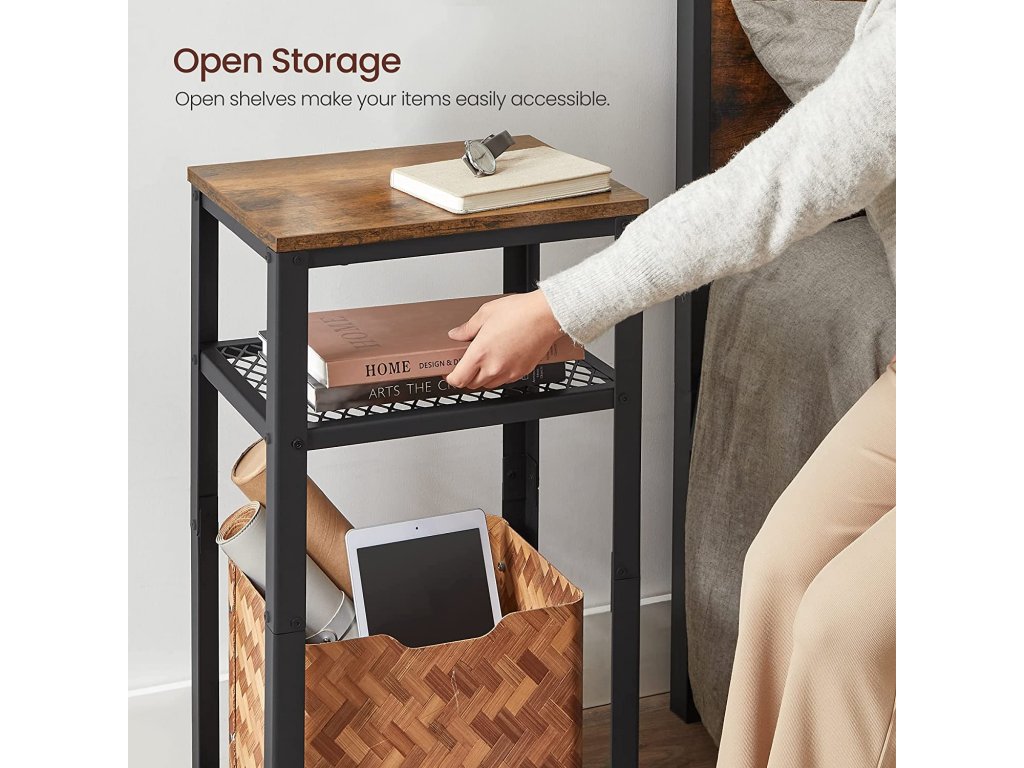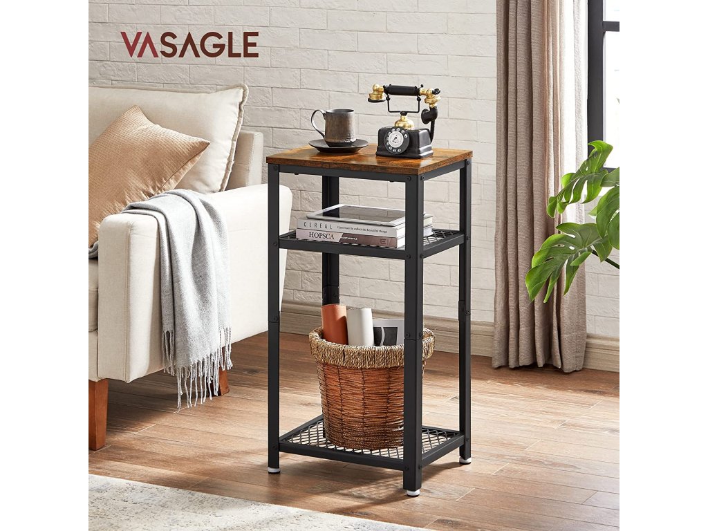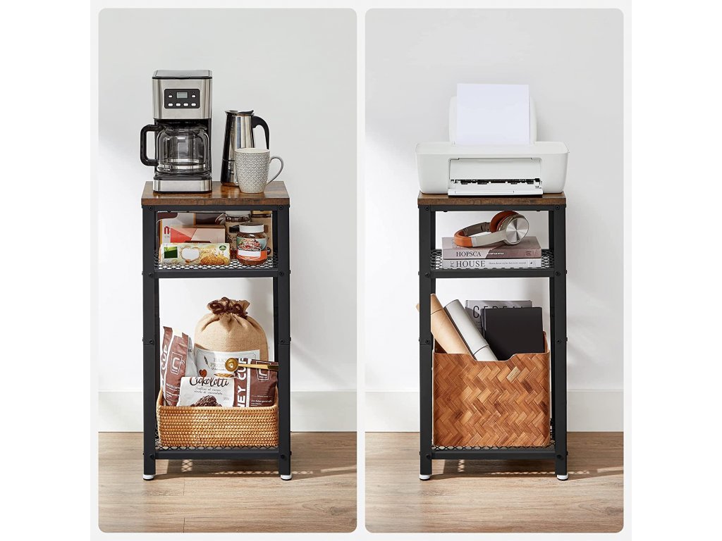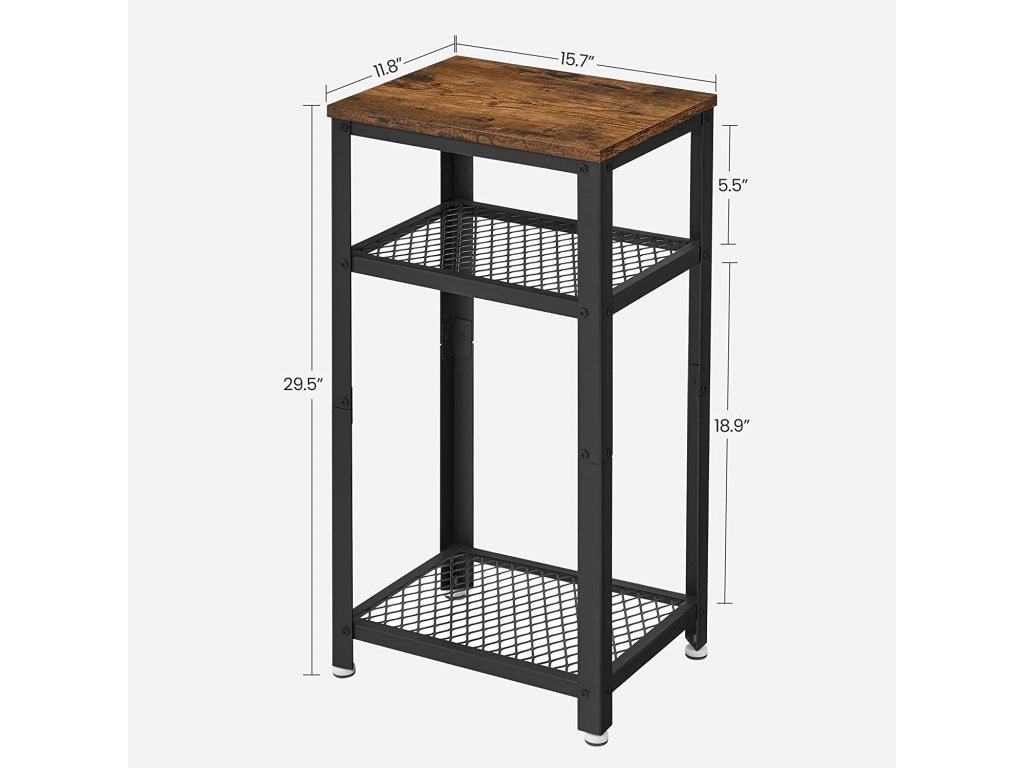 Tento třípatrový koncový stolek kombinuje rustikální dřevo s kovovými policemi a rámem v industriálním stylu a vytváří tak klasický vzhled. Umístěte lampu nahoru, dálkové ovladače na prostřední polici a knihy dolů, aby tento koncový stolek fungoval naplno. Stolek se 2 policemi ze síťoviny, s nastavitelnými nohami, stabilním kovovým rámem a snadnou montáží