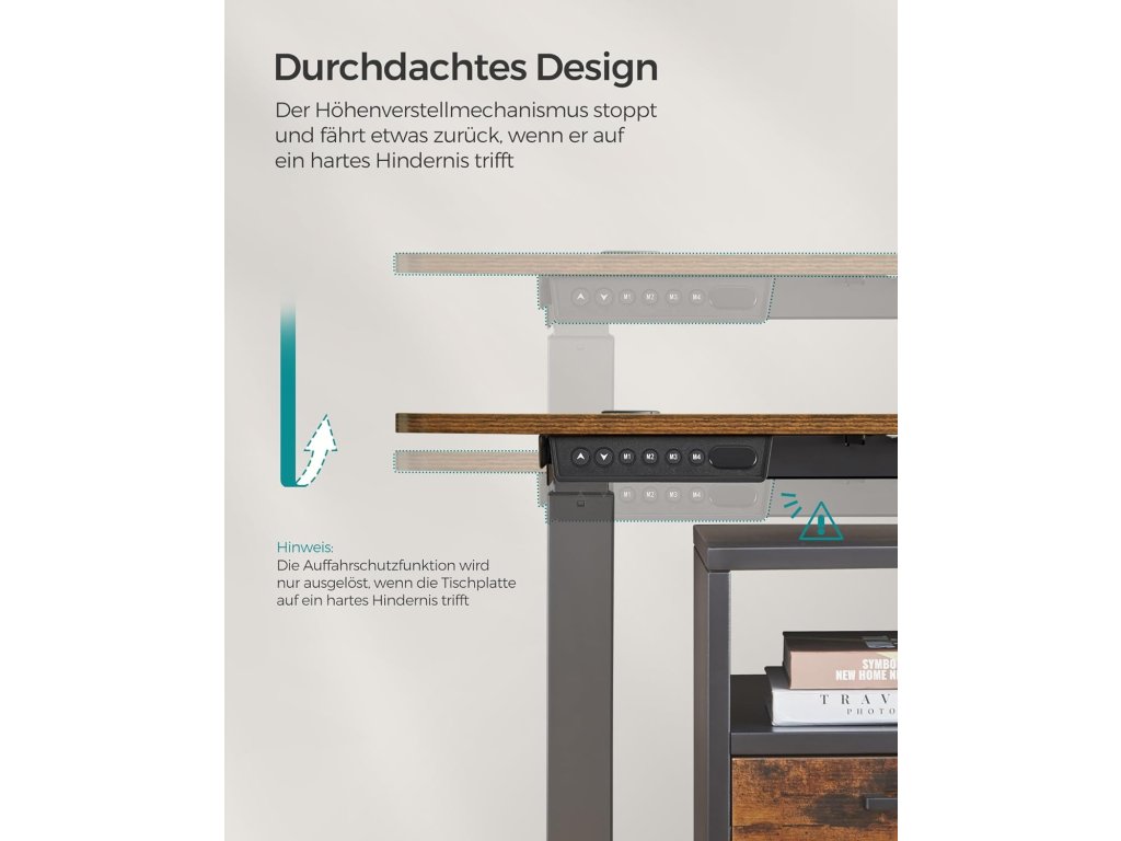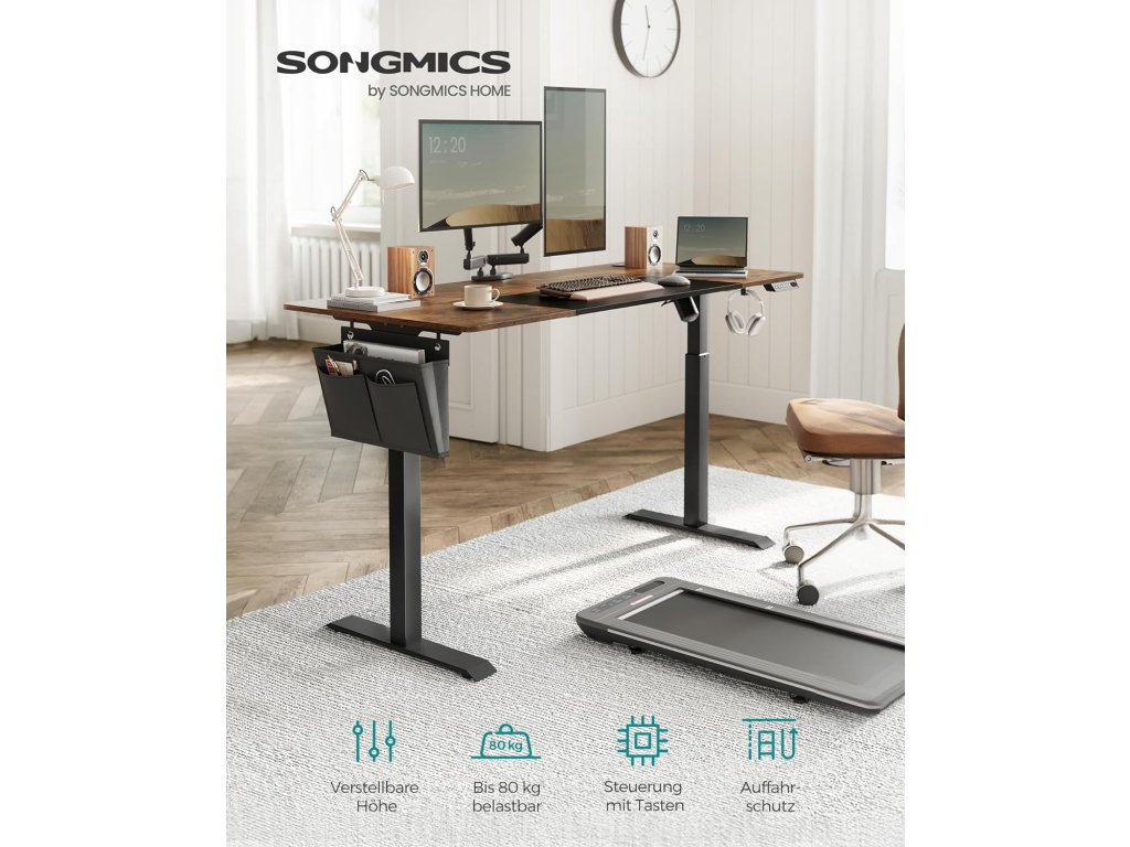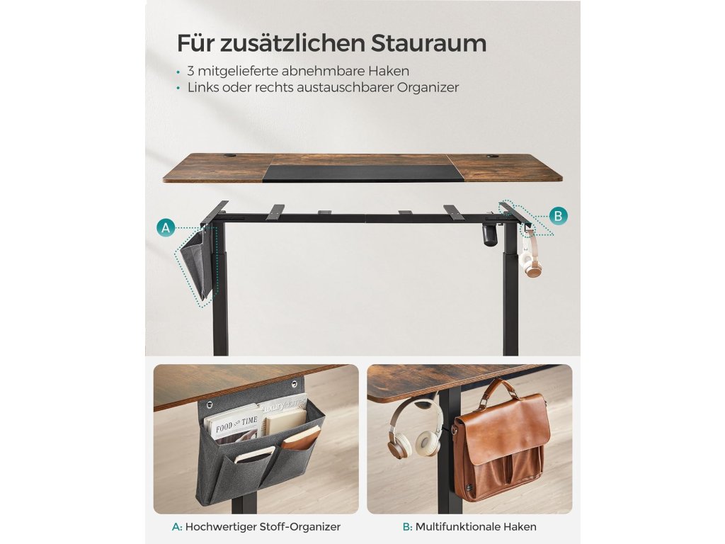 Látková kapsa na levé nebo pravé straně na knihy, časopisy a další, 3 háčky na sluchátka a tašky, 2 zásuvky pro dobré vedení kabelů. Nic nepodpoří vaše soustředění více než uklizený stůl! Výškově nastavitelný elektrický psací stůl, plně nastavitelný, splétaná deska, paměťová funkce se 4 výškami